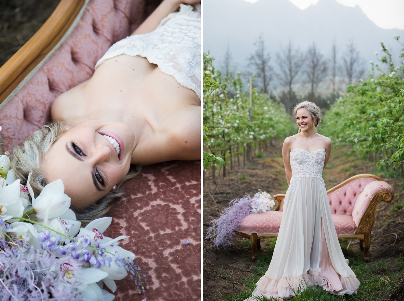 The inspiration behind the shoot was all the beauty around us with the new season of spring arriving. The birds singing, the new green leaves showing and the spring blossoms full in bloom… I wanted to combine the beauty of nature with the beauty of the perfect vintage dress, vintage PINK couch , soft but modern styled flowers and the perfect model with a smile that is contagious and makes you look again and again! The look and key elements for the shoot was modern soft, pastel colours with a vintage twist.