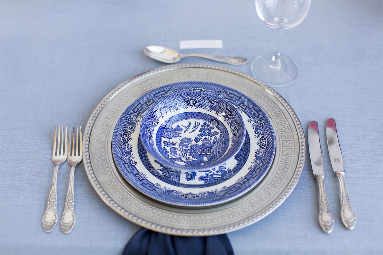 Our inspiration was creating a modern spin on an old fashioned theme and a look that was modern yet soft and romantic, with just a touch of vintage. The colour scheme we used was Delft blue, antique silver and shades of blush. Key elements included: Nederland and Chinese Delft, Victorian silver cutlery, brushed silver, navy blue candles and napkins, a sky blue tablecloth, Delft stools mixed with ghost chairs, and a floral carpet. We used flowers like orchids, peonies, hydrangea, and roses. The bodice of the dress, which was designed, made and hand-painted by Preez, was also Delft-inspired.