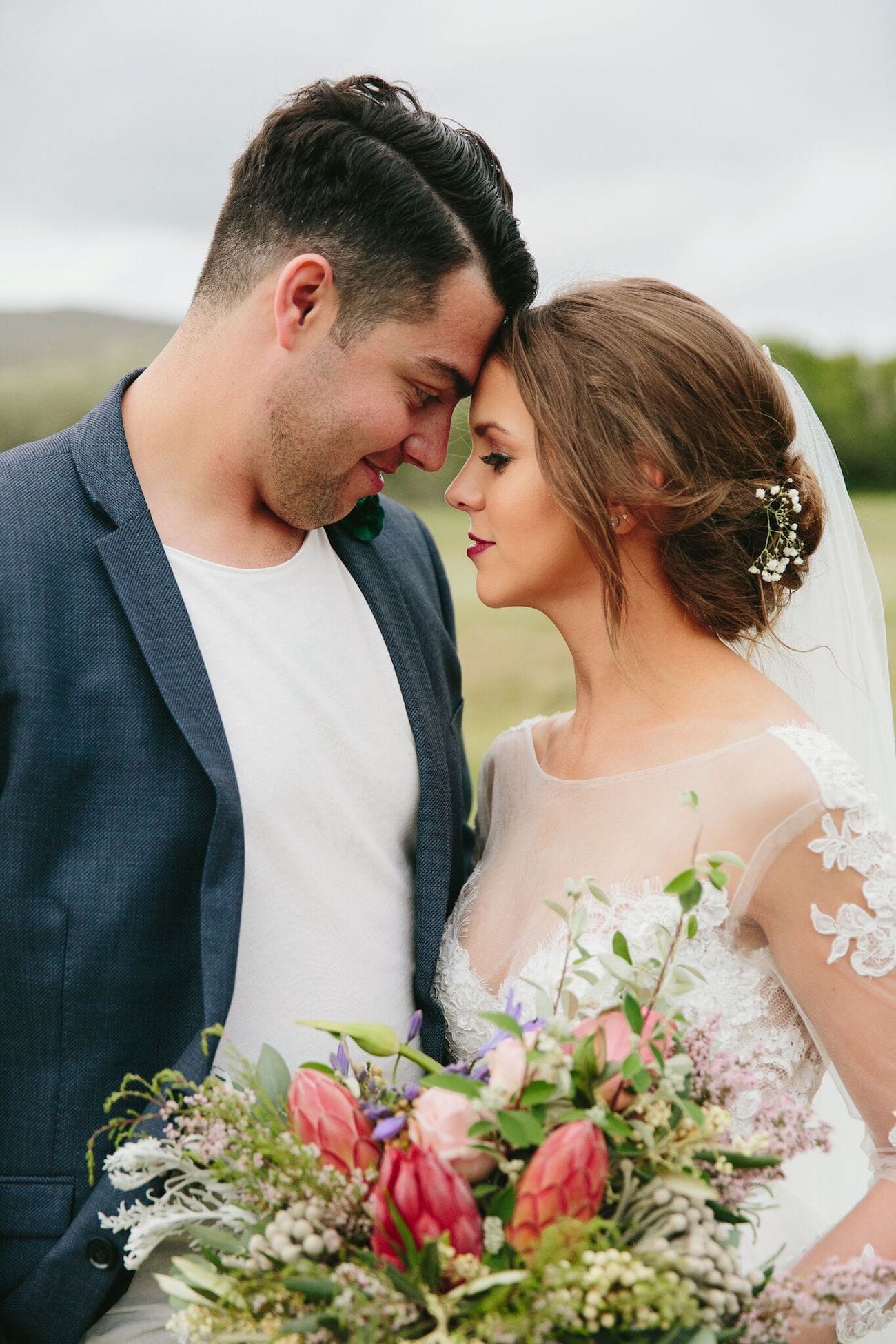 They say (whoever they are, but *I* definitely say) that the best weddings are those that reflect the personalities of the bride and groom. Well, Coenie and Anuscka’s is definitely one of those. Anuscka describes them as “fun, quirky, but romantic” and that is pretty much the perfect expression for their wedding day too, which takes ideas we love and gives them their own sweet little twists. First off, forest ceremony (love!) under an archway decked in proteas and lines of lace bunting. Then the reception, which brought the forest indoors with loads of greenery, more proteas, wood textures and loads of magical, whimsical touches like little bunnies on the tables, fairy lights throughout, and even an adorable donut display. It’s so fun and pretty, and talk about pretty – the bride is a knockout, rocking a low back, lace sleeve gown and a berry lip. Oh, I could go on and on, but let me rather hand over to the darling Coba Photography for her pictures, and the bride for her story.