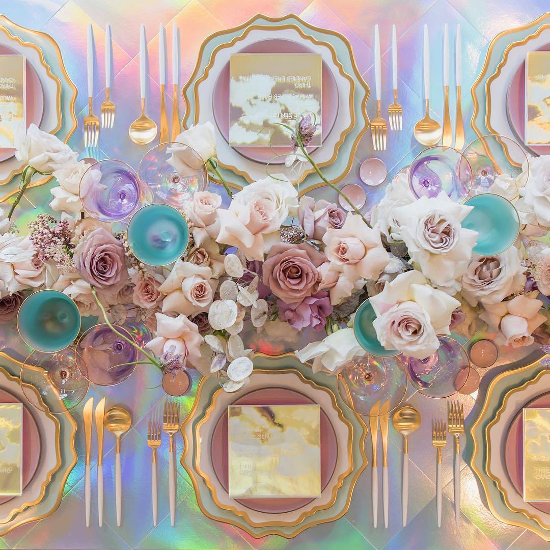 To be clear, I’m not really suggesting we’ll be seeing loads of unicorn-themed weddings. But the explosion of unicorn/mermaid iridescence over the last couple of years has finally influenced wedding design, and this year we’ll definitely be seeing holographic and iridescent touches all over the place. It’s the perfect complement to 2018’s Pantone Colour of the Year, Ultraviolet, and also fits nicely in with a trend I picked last year that will also be huge in 2018: celestial weddings.