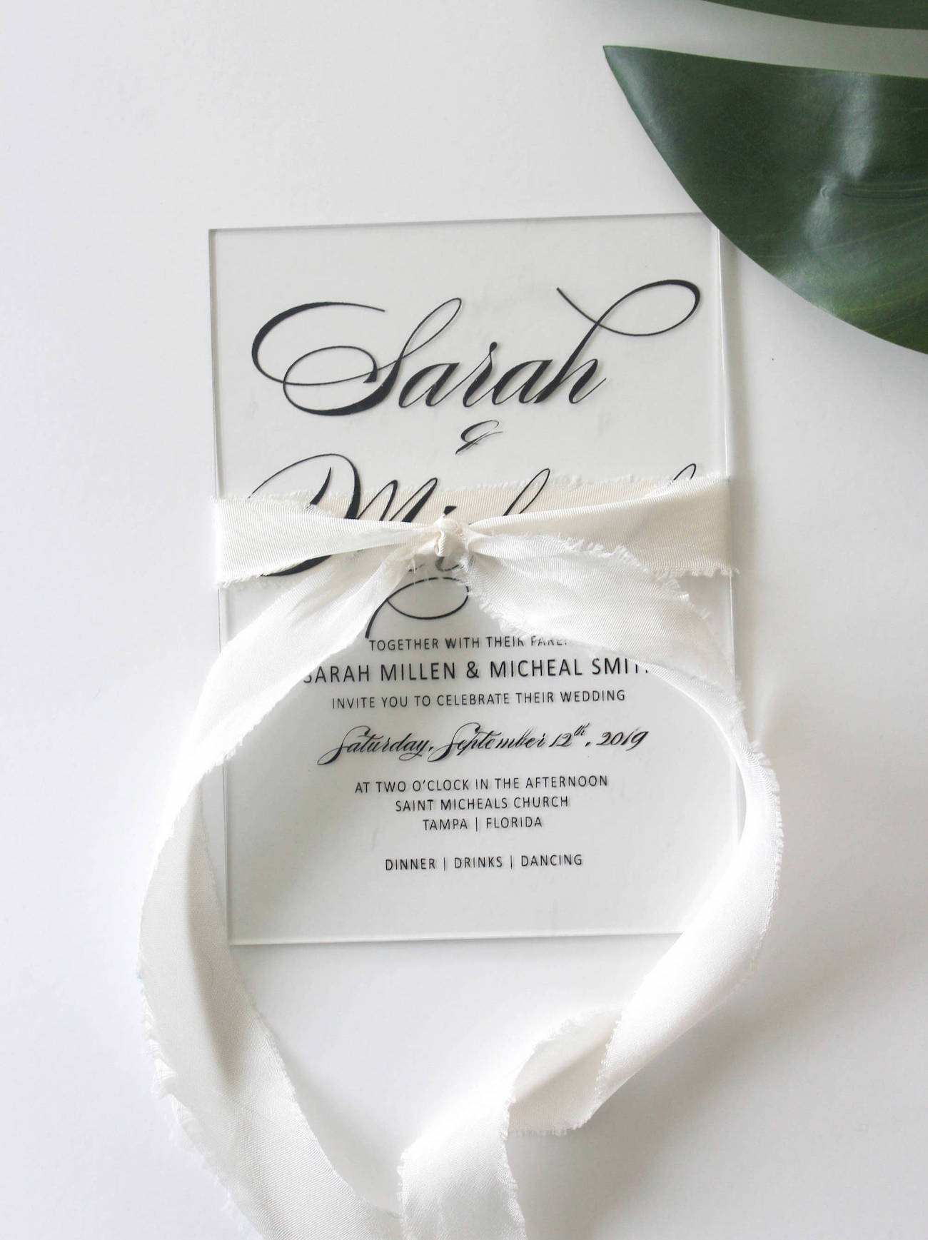 Credits: Fiona Clair Photography/A Little Thing Called on SouthBound Bride (top) | Transparent Acrylic Wedding Invitation by Green Mango Kraft on Etsy (bottom)