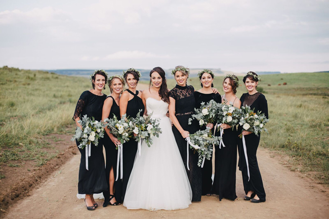 Set amid the emerald hills of the Natal Midlands is this wedding, which defines ‘organic elegance’ to a T. My first glimpse of Kyllie & Tom’s big day was a pic of the bride and her maids – I was completely won over by the mix of wild natural and chic formal style, and when the lovely Bron of Vanilla Photography sent over the rest of her incredible images I knew my instincts had been right on the money! With the amazing Carolyn of Adore Weddings decking out Netherwood in swathes of greenery and white blooms, from Delicious Monster centrepieces to green runners and chandeliers (not to mention the bride’s fabulously oversize foliage bouquet), the organic part of the equation was definitely covered, and combined with Kyllie’s amazing feather-embellished Pronovias gown, the suited-and-booted groom’s party, and that classic monochrome palette, it’s beautiful from start to finish. Special mention to the one spot of bright colour – a Smarties wedding cake! This fun, personal detail is what SBB weddings are all about.