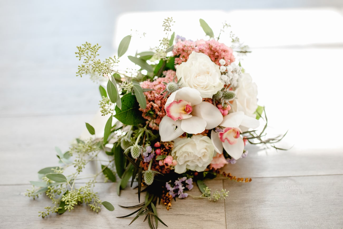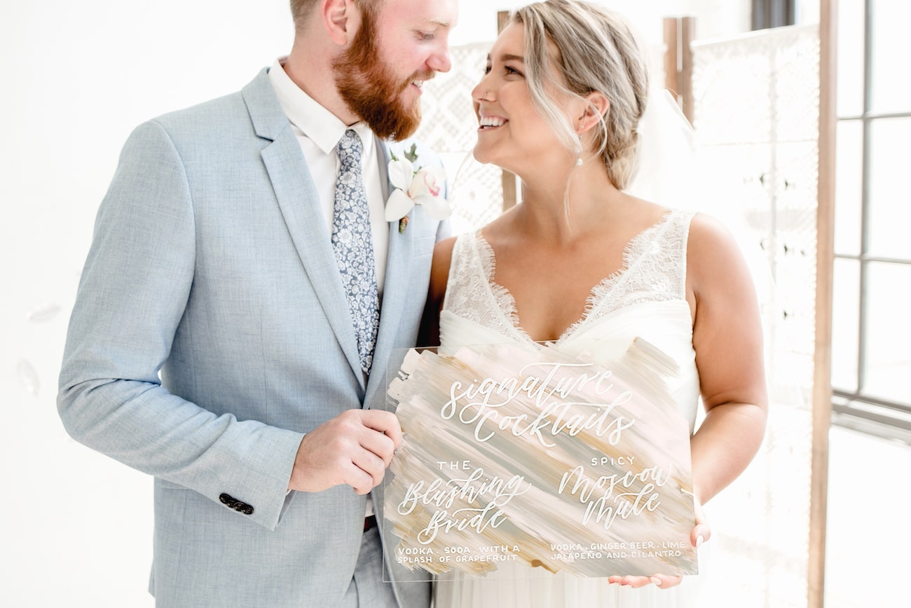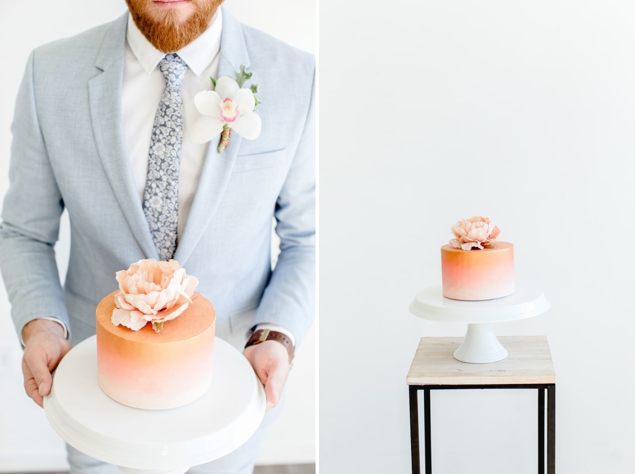 Our florist wanted to keep things pretty muted, but also wanted to add a couple of touches of colour into their pieces. By adding a couple orchids into the bouquet with a dreamy lavender contrast, it was modest yet eye catching. And we loved the detail of the twisted wire on the bout! We were in love with our acrylic signage created by Letters & Dust which featured the pastel colours with brush strokes to mesh them all together. Our miniature cake was also perfect for a couple to cut, complete with a sherbert orange that ombred down to a light brushed blush which perfectly contrasted with the groom’s suit.