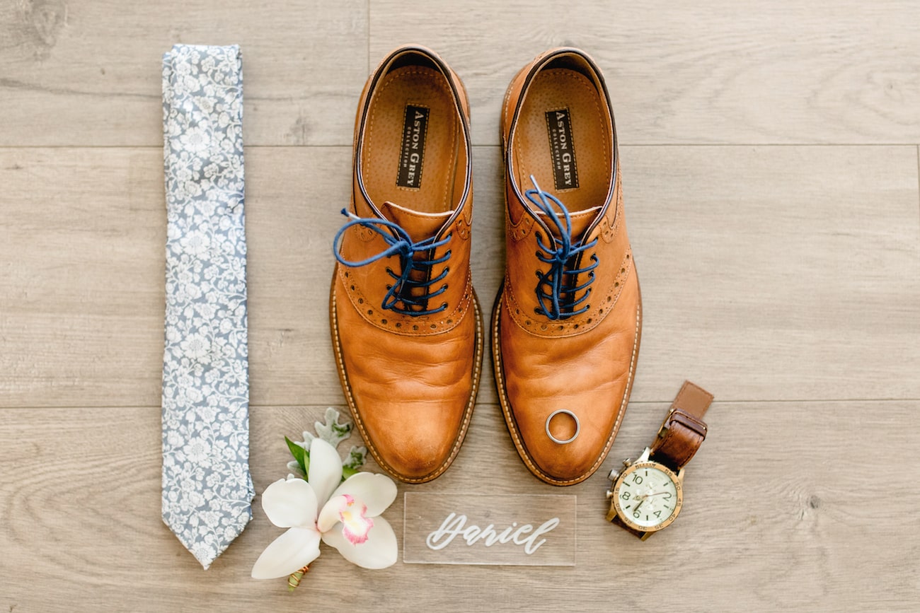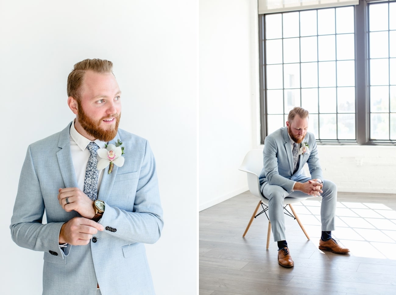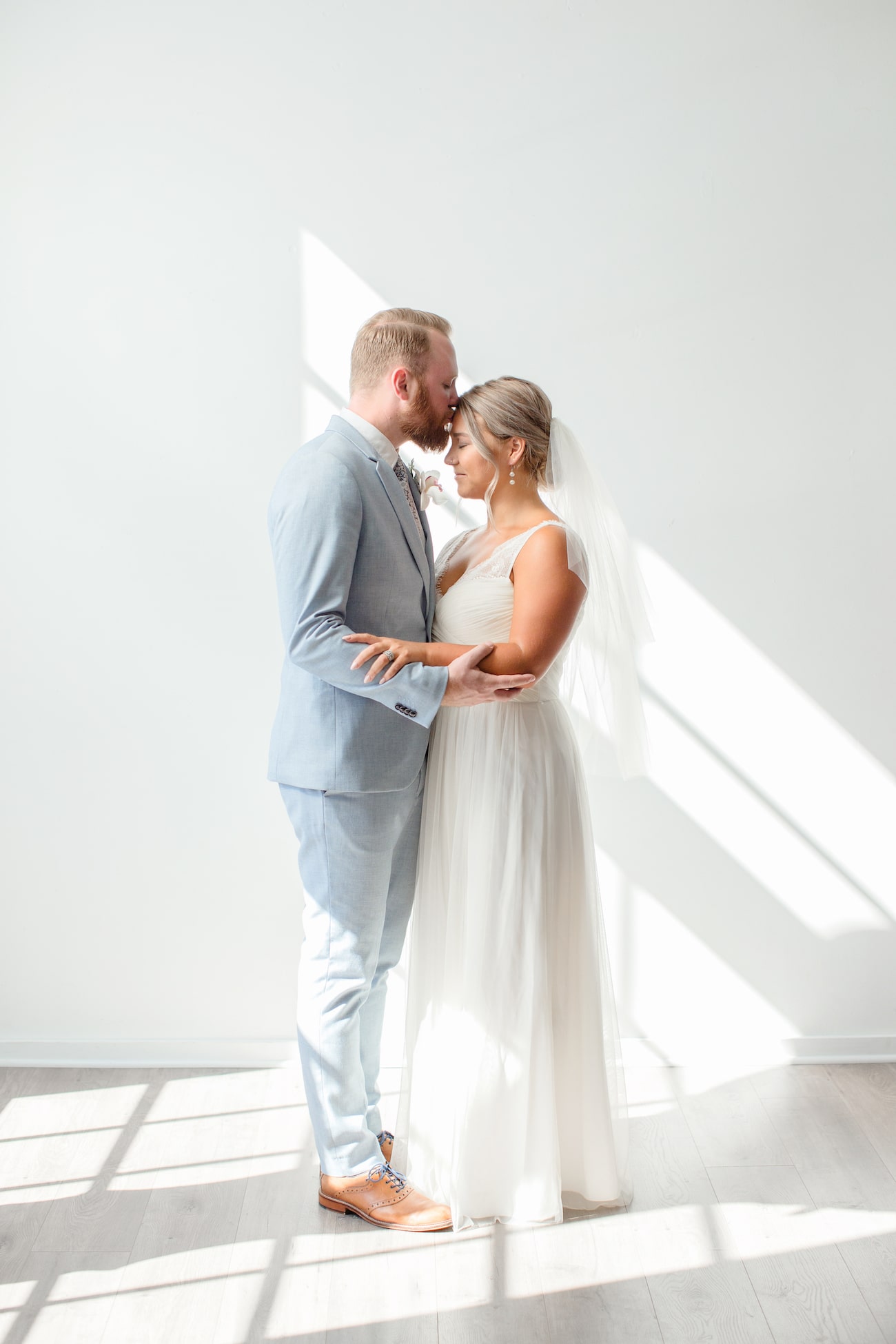 Our inspiration was based around the suit that our groom already owned (seriously, what a cool guy to own such a unique suit! He credits that to his wife!) We then pulled in other pastel elements that would still be able to pop with soft and airy photos. For our bride, we desired a soft, airy fabric so that her groom could spin her around the room and romantically dip her. Her veil even included soft pearl pink details which was carried through the rest of the gallery. The perfect early autumn day provided ideal natural light and even allowed us to play with shadows. We really decided to focus on the couple and their loving interaction!
