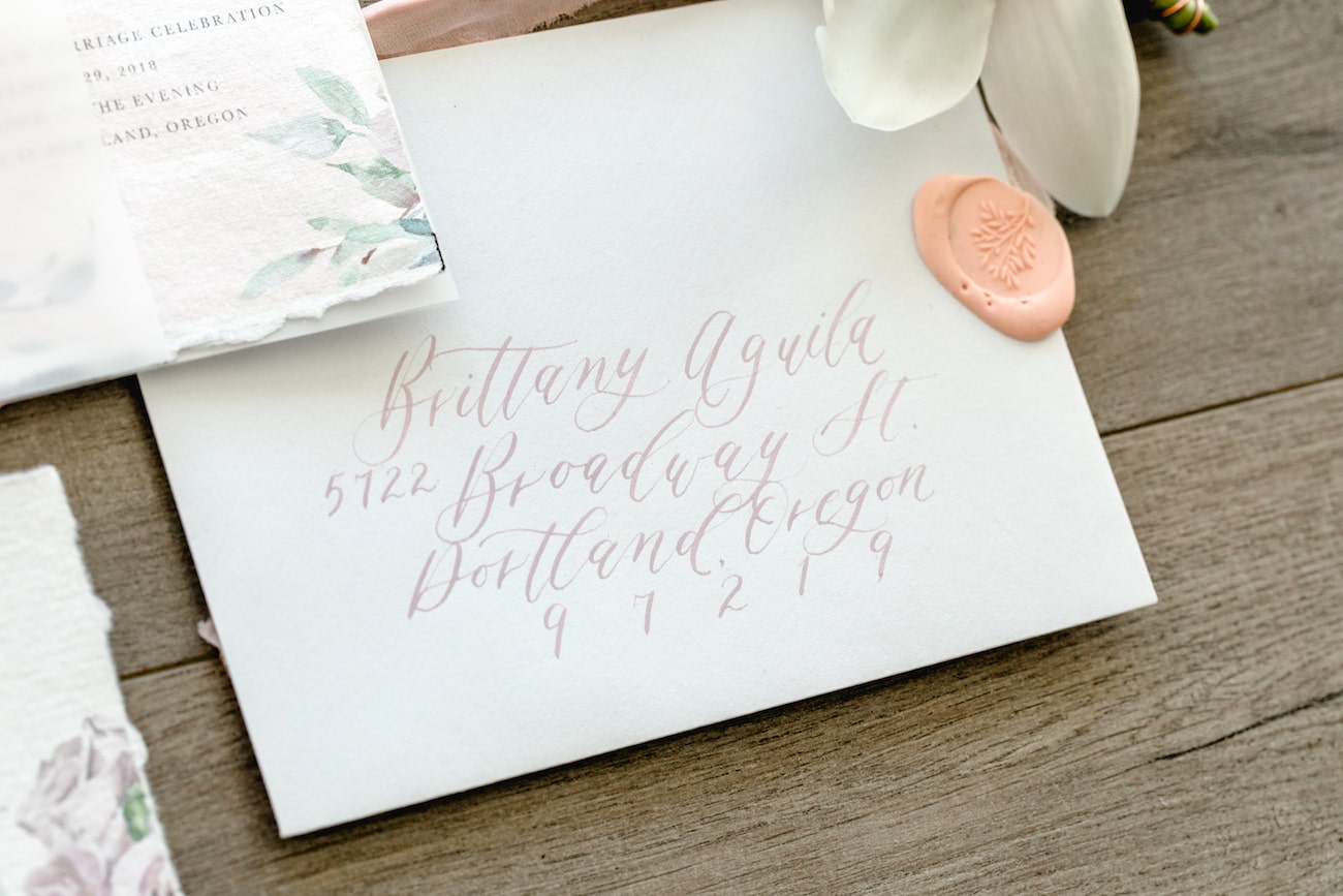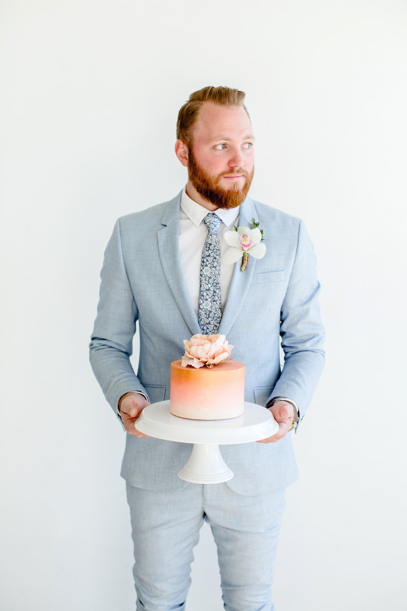 If there’s one thing that never fails to inspire me when it comes to weddings, it’s beautiful colours and unique combinations of hues. Which is why today’s shoot made my little heart sing when I received it from a talented US team headed by Kara Taylor Photography and Peachy Keen Coordination . It was inspired by – believe it or not – a suit. A suit in a gorgeous shade called Osprey Blue (isn’t that a wonderful name for a colour?), which combines stunningly with a very soft peachy coral (love this as a soft wedding-friendly alternative to Pantone’s new Colour of the Year, Living Coral). The palette is perfectly complemented by series of soft, romantic details (hand lettered watercolour stationery, with transparent escorts as a modern touch), beautiful blooms, and light and airy images in a lofty neutral space. It’s just LOVELY. So let’s step in and enjoy it, shall we?