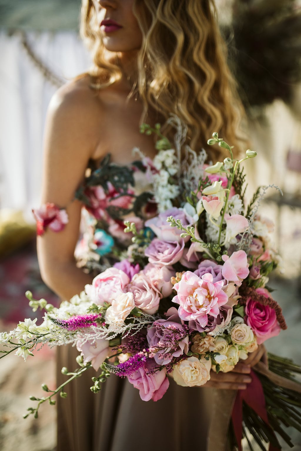 Not many South Africans explore the opportunity to set up camp in an open location to create the wedding of their dreams. We wanted to show how easy and attainable this actually is. Within two hours we had set up the perfect little elopement area with only four people working on it. It really is a great idea to find the perfect spot, and ask your vendors to come to you for your own custom setup! Since the sand dune at the location looks very desert-like, we decided to theme the shoot around the concept of the Nomad – ever-changing, ever-moving. A lot of young couples these days want something unique for their wedding. They want to create special photographs of their nuptials that no one else has. Overall, it was an incredible day with a lot of firsts (letting off those smoke grenades was terrifying for second shooter, Leigh Benson!), bumps on the head (second shooter Roxanne Roerink eventually had to stand holding the bamboo structure for over an hour in the hot sun, until the flowers were fully assembled, so that it didn’t blow over!). Not to mention, since it was a mine in Africa, we had CORTAC security as our own personal security detail – we felt like such VIPs!