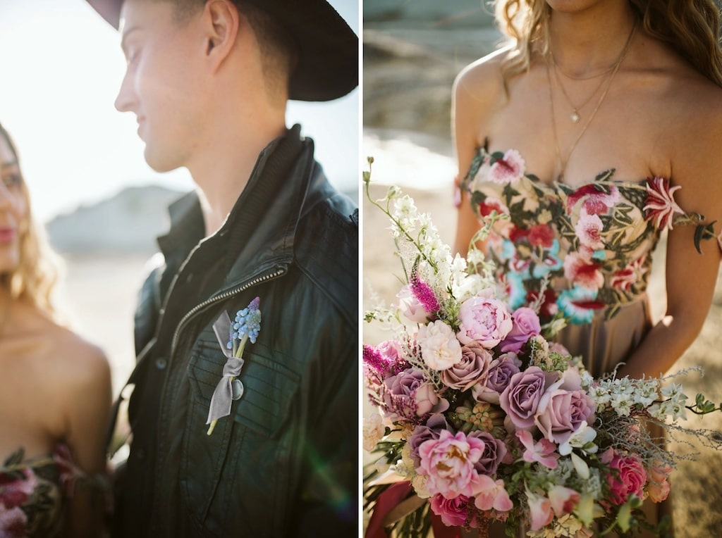 The flowers were done by floral genius, Fleurdita (Dale Sandberg). Her idea to create a hanging airplaint sculpture paired well with the tufts of pampas grass found naturally on site. The colours used in the arrangements complemented our decision to stay away from the much-used burgundy and gold combo – and make the move instead to include burnt oranges, dusty pinks, and honey colours. The couple, Bianca and Connor, have been together for six years and it’s only a matter of time until they do this for real! This type of elopement is perfectly suited to them, They have their own unique style (Bianca would rather wear a pair of Timberlands than wedding shoes), and we encouraged them to express themselves completely during the shoot – hence the sexy leather jacket and hat combo on Conner! The gorgeous boho-chic gown by Elli-Nicole encapsulates the day perfectly. Untraditional, free-flowing, organic, and earthy. The lace applique details pick up beautifully the flowers used in the shoot, and Bianca’s face when she saw the gown said it all!