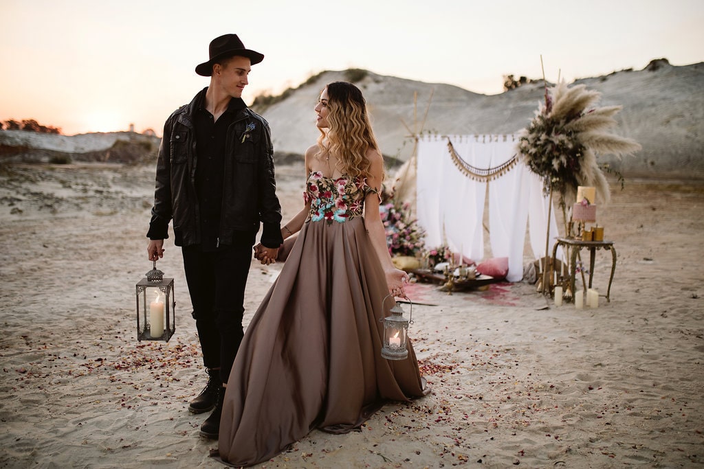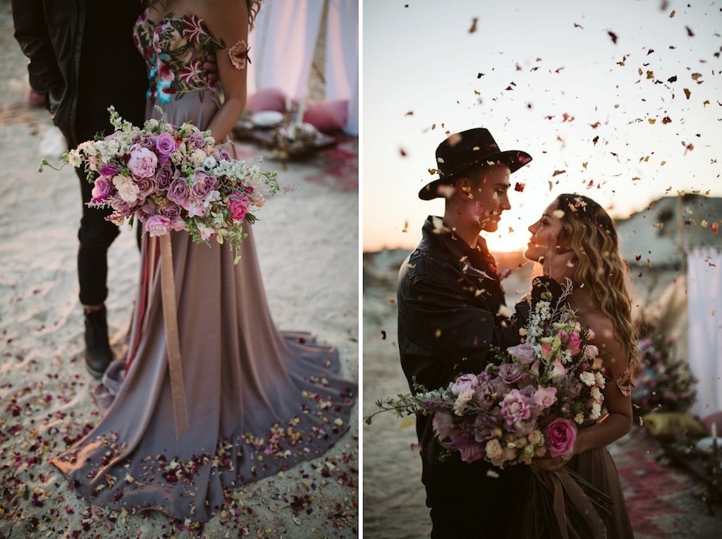 Happy 2019, lovely ones! And a huge big special welcome to all of you who are just engaged and joining us on SBB for the first time! We’re kicking off the year with some gorgeous modern boho inspiration with a desert vibe, brought to life by a talented local team. (Start as you mean to go on, I say!) I especially love that this one is an elopement, because styled elopements have become one of my absolute faves recently – I just adore the idea of escaping with your ride or die to the dunes and having a dreamy picnic while the sun goes down, perfectly captured by a photographer like the lovely Jessica Notelo! It also shows you don’t have to go to Morocco or the Mojave to capture this very much on-trend desert style. And OMG you guys the details! Cake, dress, flowers, oh my! Let’s get inspired, shall we?