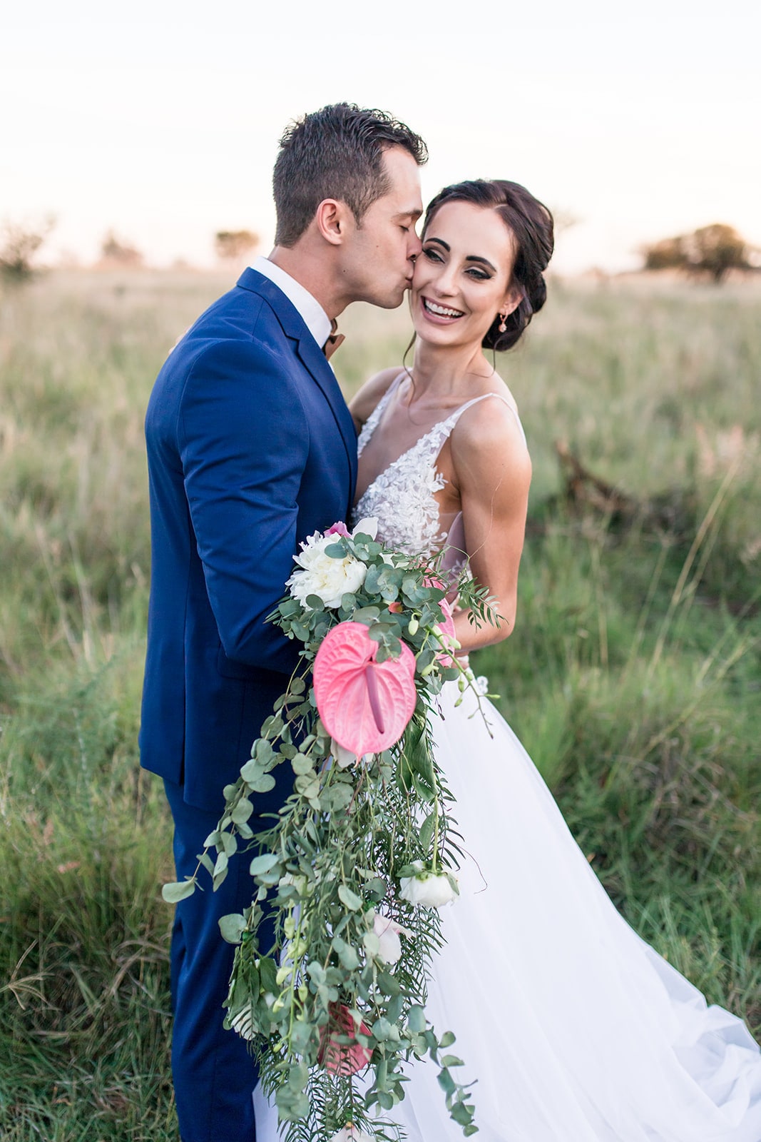The combination of copper and greenery makes for SUCH a gorgeous wedding palette – Elsje and Pieter’s wedding, captured by Werner J Photography, adds little pops of pink and blue and ties it all together perfectly! From the romantic botanical invitations and other stationery elements to the macaron and copper drip detail cake (what a cake!), from the lace and floral bridesmaid dresses to the abundant florals, and from Elsje’s stunning gown to her showstopping bouquet, you’ll want to pin every dazzling detail!