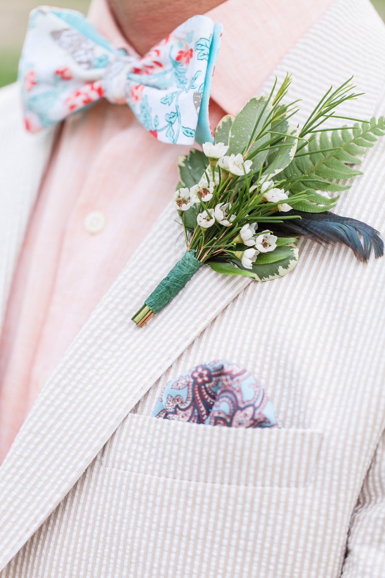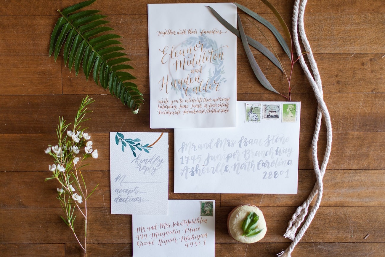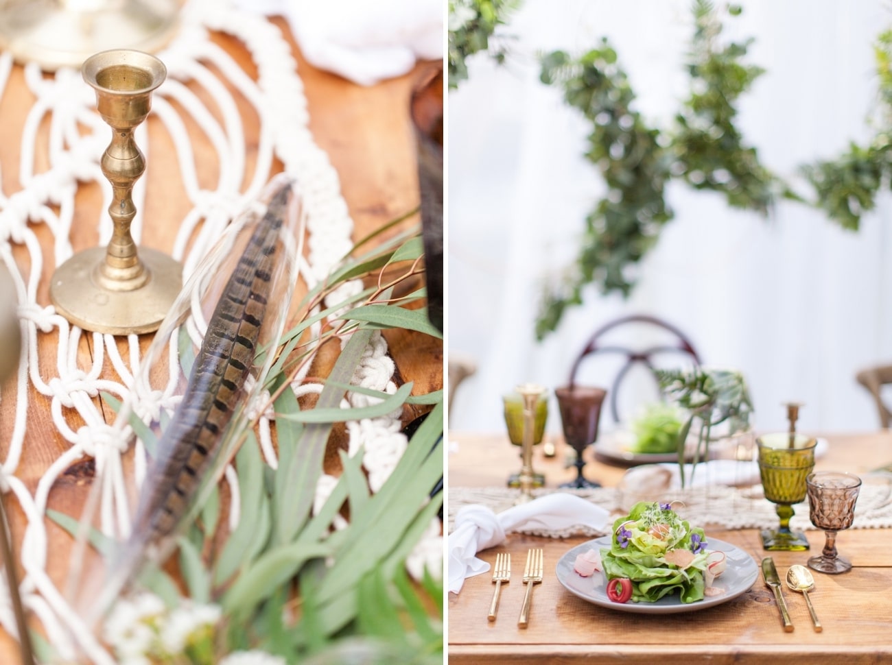 Highlights include a custom watercolor invitation suite, in which elegant metallic copper calligraphy on parchment paper is laid over a monogrammed watercolor wreath of greenery on copper, and accompanied by coordinating RSVP cards and envelopes. The suite foreshadowed our featured reception design element and incorporated the colors and boho-mod vibe in exquisite style with its varied paper textures and use of natural earthy colors.