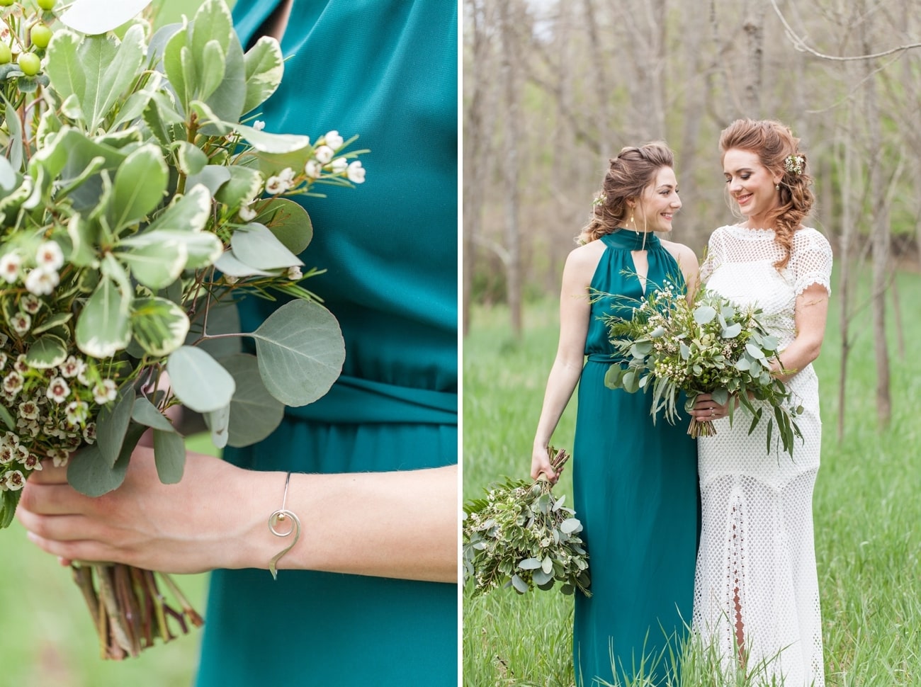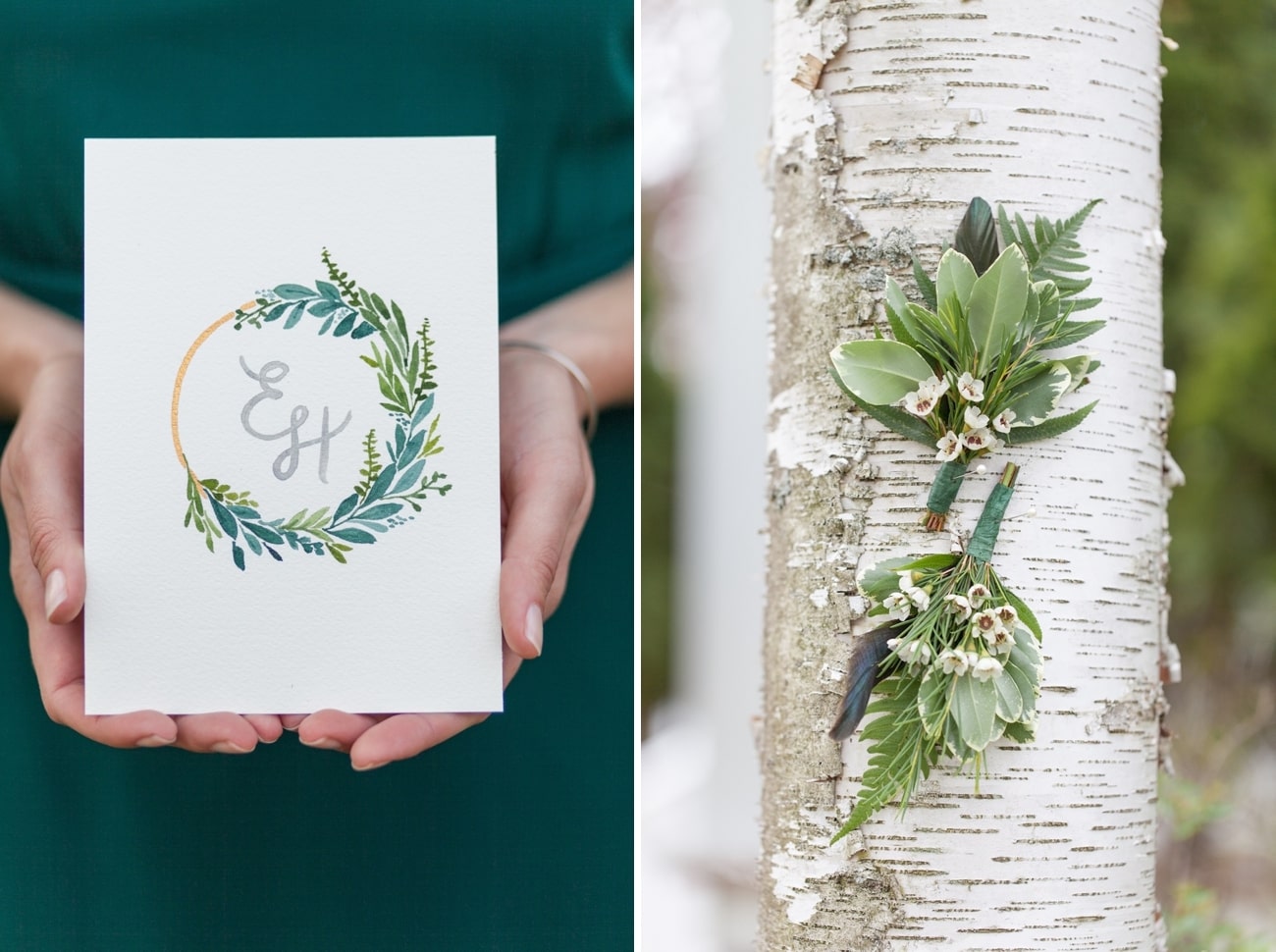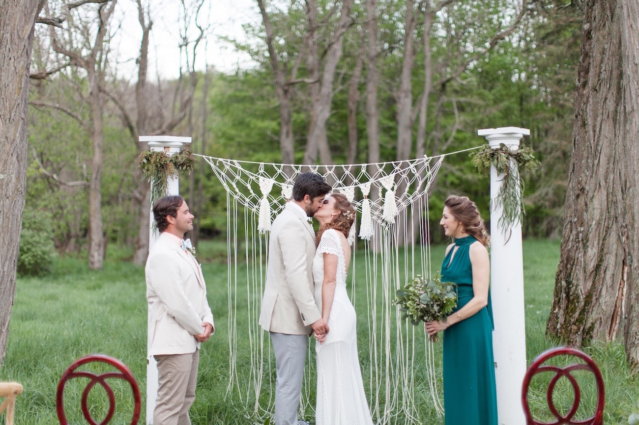 This styled shoot captures the local Northwoods vibe in fresh modern style. It features the best of northern Michigan’s natural beauty, with its locust grove ceremony decked out in layers of copper-accented macrame, its farm table dinner under a glorious five-wreath greenery installation by an idyllic inland lake, an adjacent historic stone farmhouse for bridal party preparations, and a jaunt to neighboring cherry orchards in glorious full bloom. Using a color palette of natural woodland greens, stone greys, and earthy coppers and golds, it features organic textures of wood, feathers, greenery, and macrame. A timeless circle motif is creatively woven into the design elements.