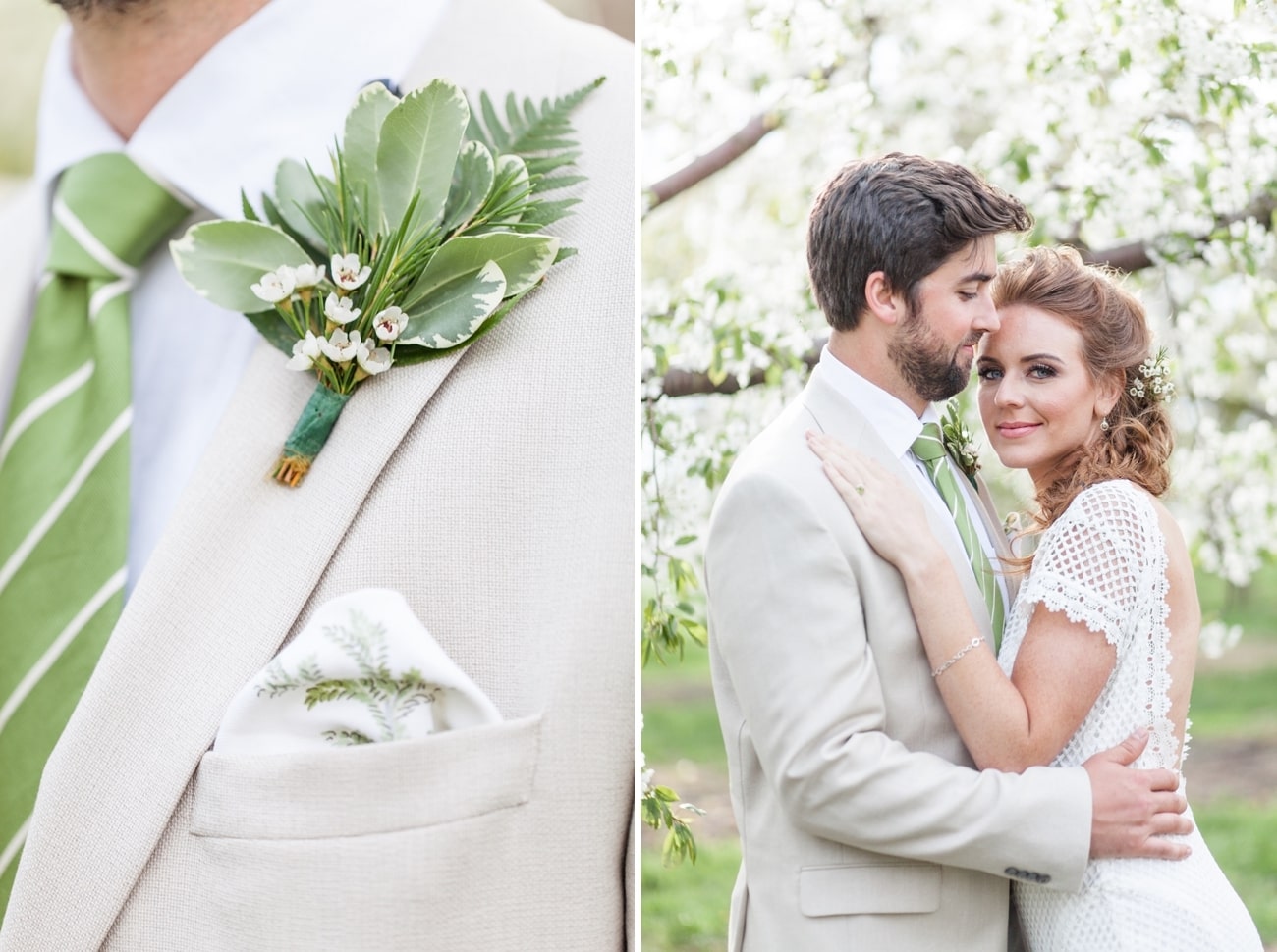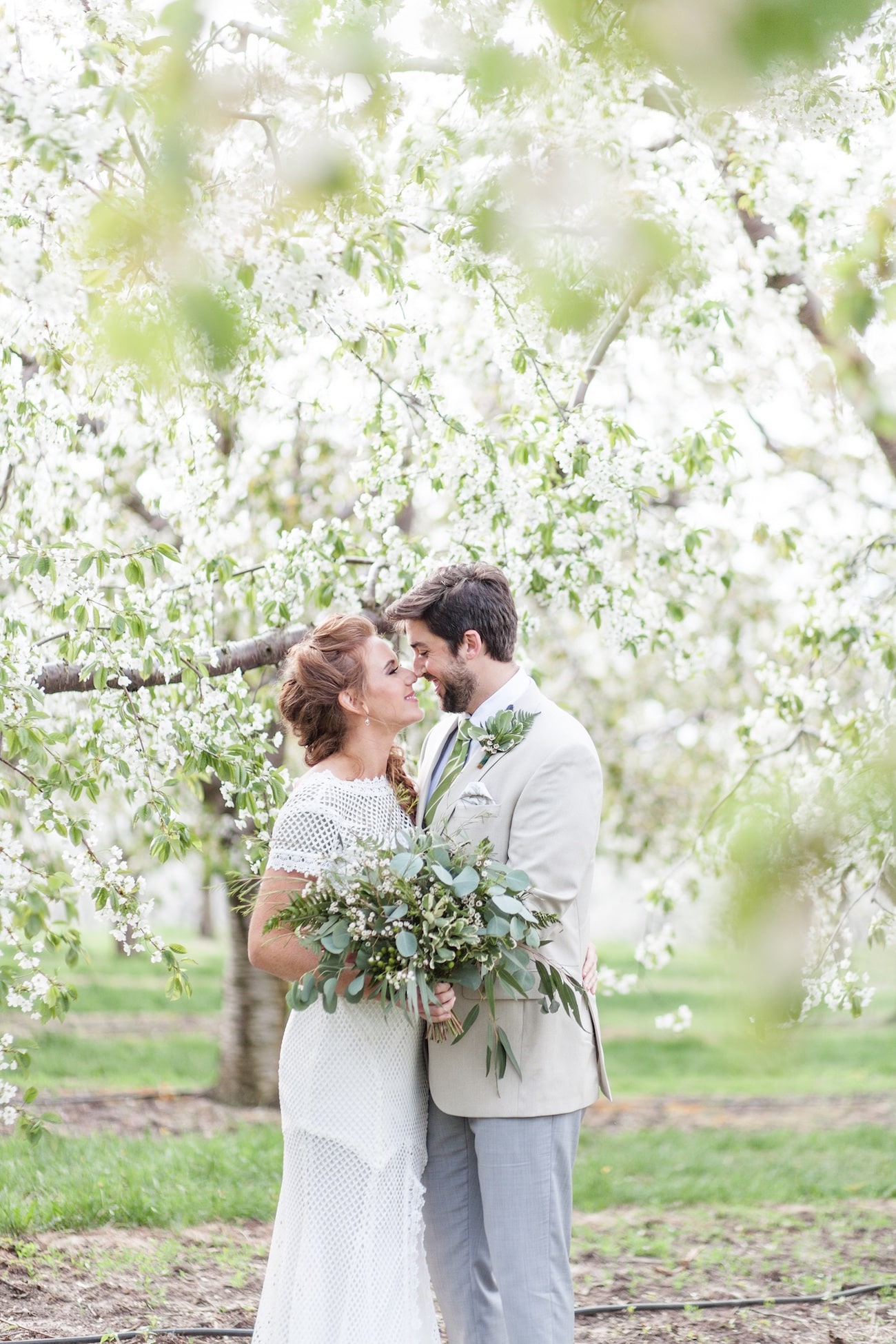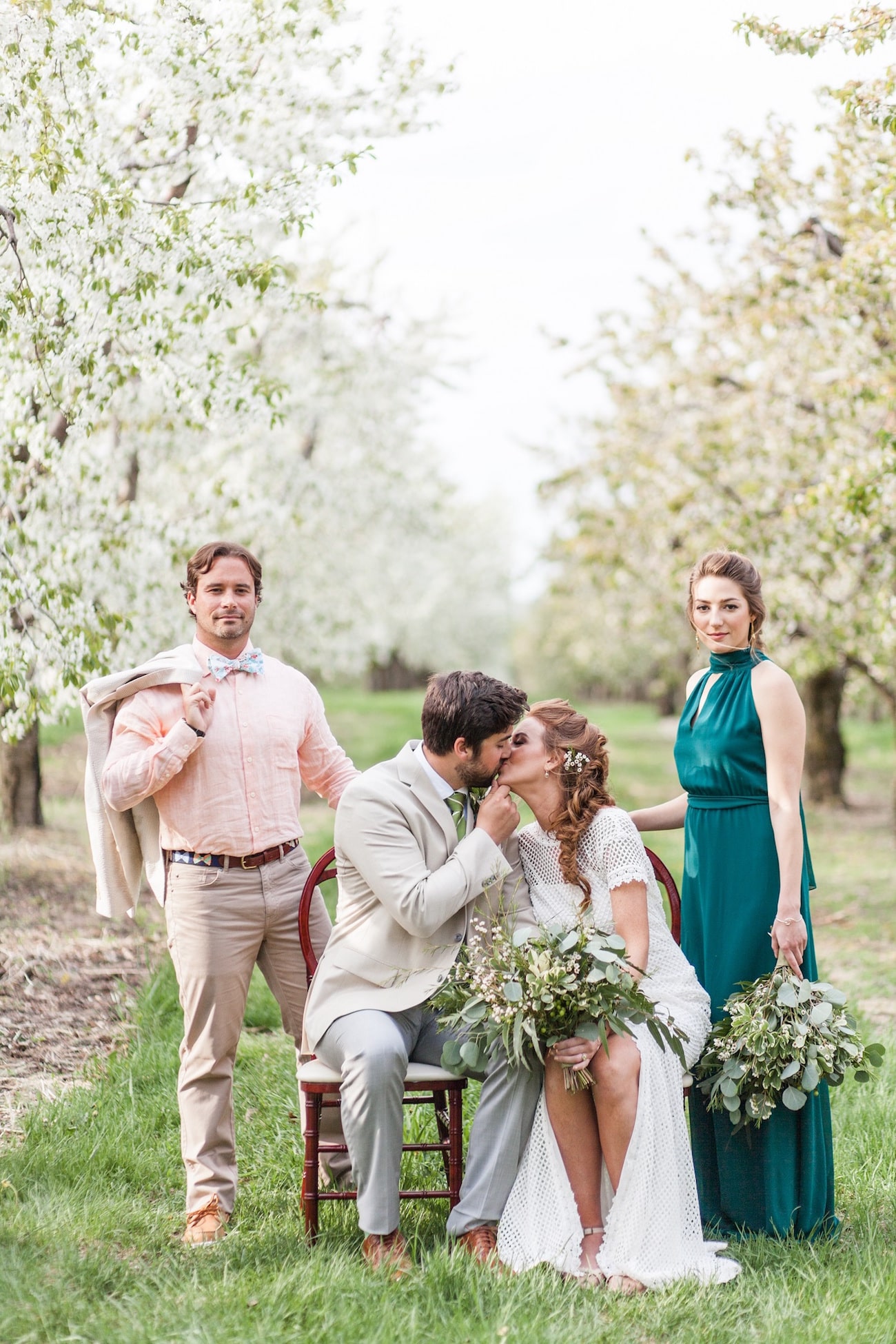 This styled shoot captures the local Northwoods vibe in fresh modern style. It features the best of northern Michigan’s natural beauty, with its locust grove ceremony decked out in layers of copper-accented macrame, its farm table dinner under a glorious five-wreath greenery installation by an idyllic inland lake, an adjacent historic stone farmhouse for bridal party preparations, and a jaunt to neighboring cherry orchards in glorious full bloom. Using a color palette of natural woodland greens, stone greys, and earthy coppers and golds, it features organic textures of wood, feathers, greenery, and macrame. A timeless circle motif is creatively woven into the design elements.