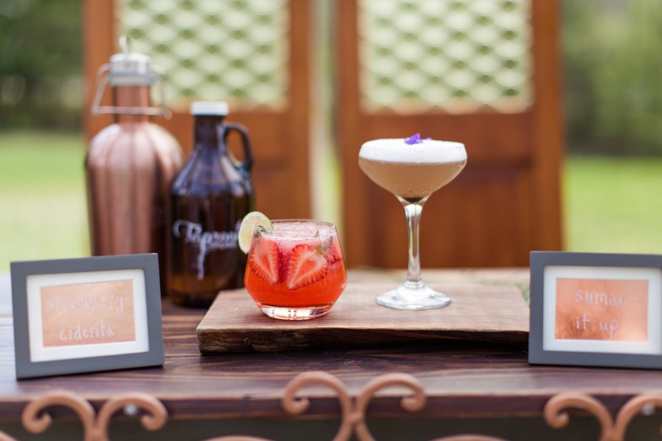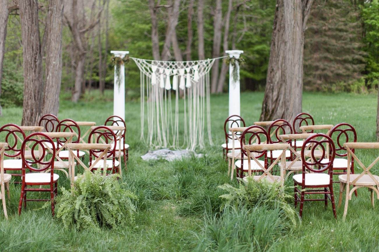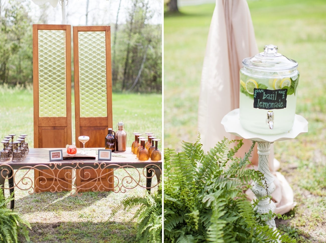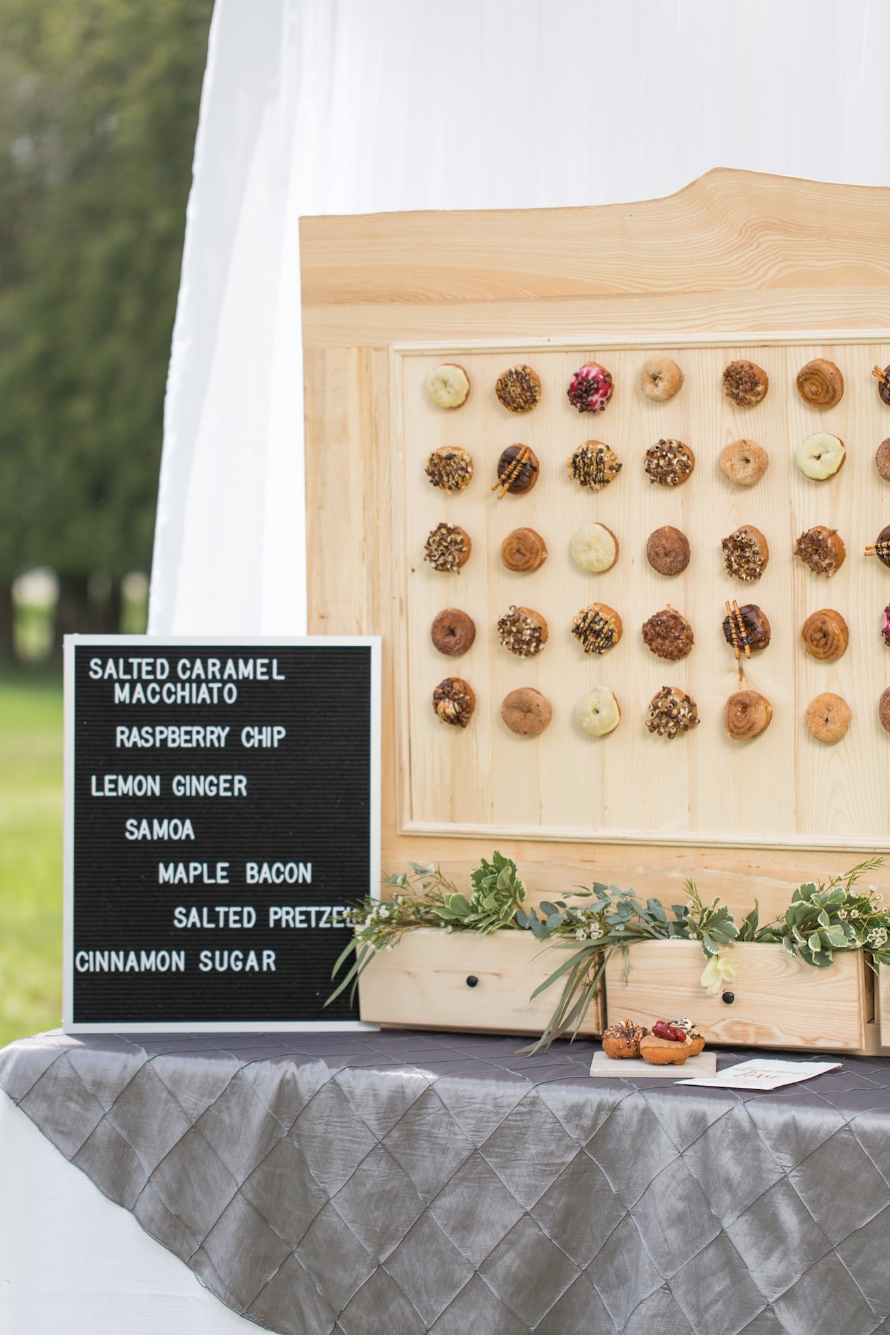 Our decor included a cocktail bar with locally-inspired signature drinks: a ‘sumac it up’ and a ‘strawberry ciderita’. Basil lemonade on an antique stand and a cocktail table decked out in a charcoal linen with copper embroidery flanked the bar. Cider and donuts were also reimagined in our dessert bar featuring local hard cider served from a contemporary white pitcher placed opposite a trendy letterboard sign which depicted the flavours of mini-donuts. The decadent donuts were topped with earthy textures reminiscent of woodland elements using pretzels, chocolate chips, bacon, and ginger crystals. Natural wood edges of boards custom cut from northern Michigan trees framed a bespoke donut board complete with drawers for personalized to-go bags. Grey and white marbled tile on a charcoal pintuck linen displayed more donuts, including a s’mores flavor as a nod to summer bonfires. For the dinner reception, the modern lines of a clear-top tent were softened with champagne draping along the edges and strung with romantic bistro lights. The intertwined circles of mahogany chanel chairs, the loops of a macrame table runner, and glass orbs of feathers and greenery set in round gold stands all complemented the greenery wreaths as a focal point.