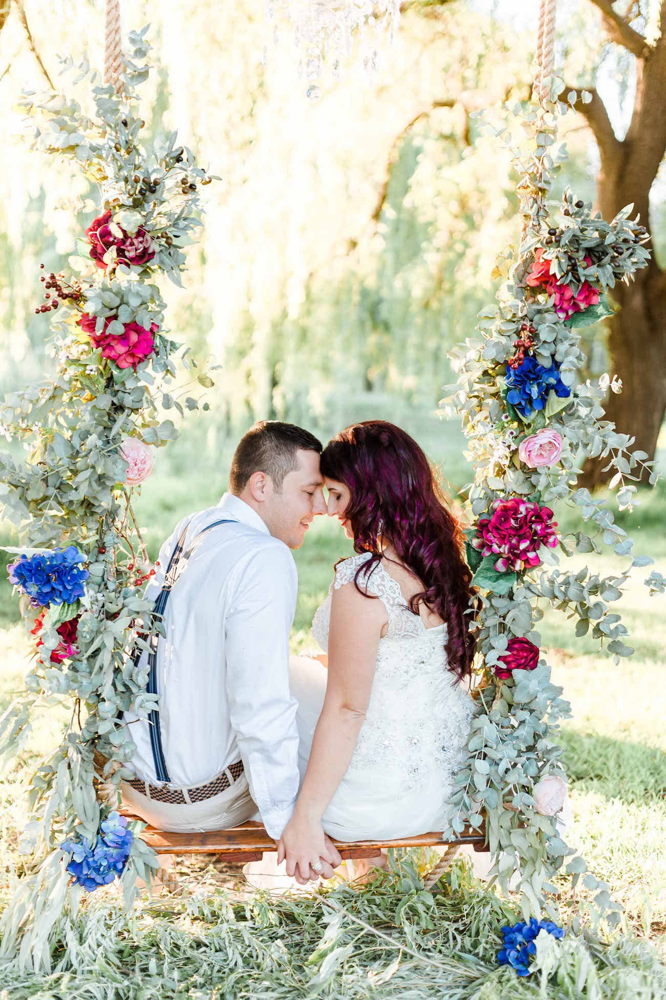 I have such a pretty couple sesh to share with you all this afternoon, chock-full of colourful flowers and summery love! (And yes, I appreciate the irony as I write this with rain lashing at my windows, sigh.) Elreza and Chris, a pair of newlyweds, decided to have a little styled session a few weeks after their big day. Still sporting that just-married glow, they roped in photographer Velani Venter and a team of creatings, then styled up a storm, embellishing a swing with blooms and basking in the golden glow of light filtering through the trees for the most romantic e-session you can imagine!