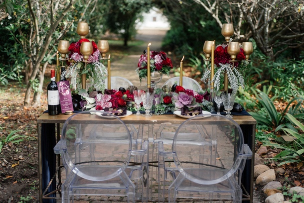 When this little gem of a styled shoot from photographer Debbie Lourens and stylist Kadou crossed my desk, I knew it would be just PERFECT for our vineyard wedding month. Not only was it shot at Spier, but the deep shades featured are so reminiscent of wine and the winelands – aubergine, burgundy, plum, fig, a deep vine green… all accented with glorious gold. This is the kind of colour scheme that often gets used for autumn or winter weddings, but with a vineyard wedding, it would be appropriate all year round as a nod to your surroundings. I just love the way these colours work together, creating something cosy but also very elegant. I also love the way that with an eggplant coloured wrap and a berry lip (courtesy of talented SBB Directory member Corlé Barnard), our model’s look perfectly complements the decor. And a seed pod crown? Adore.Read More