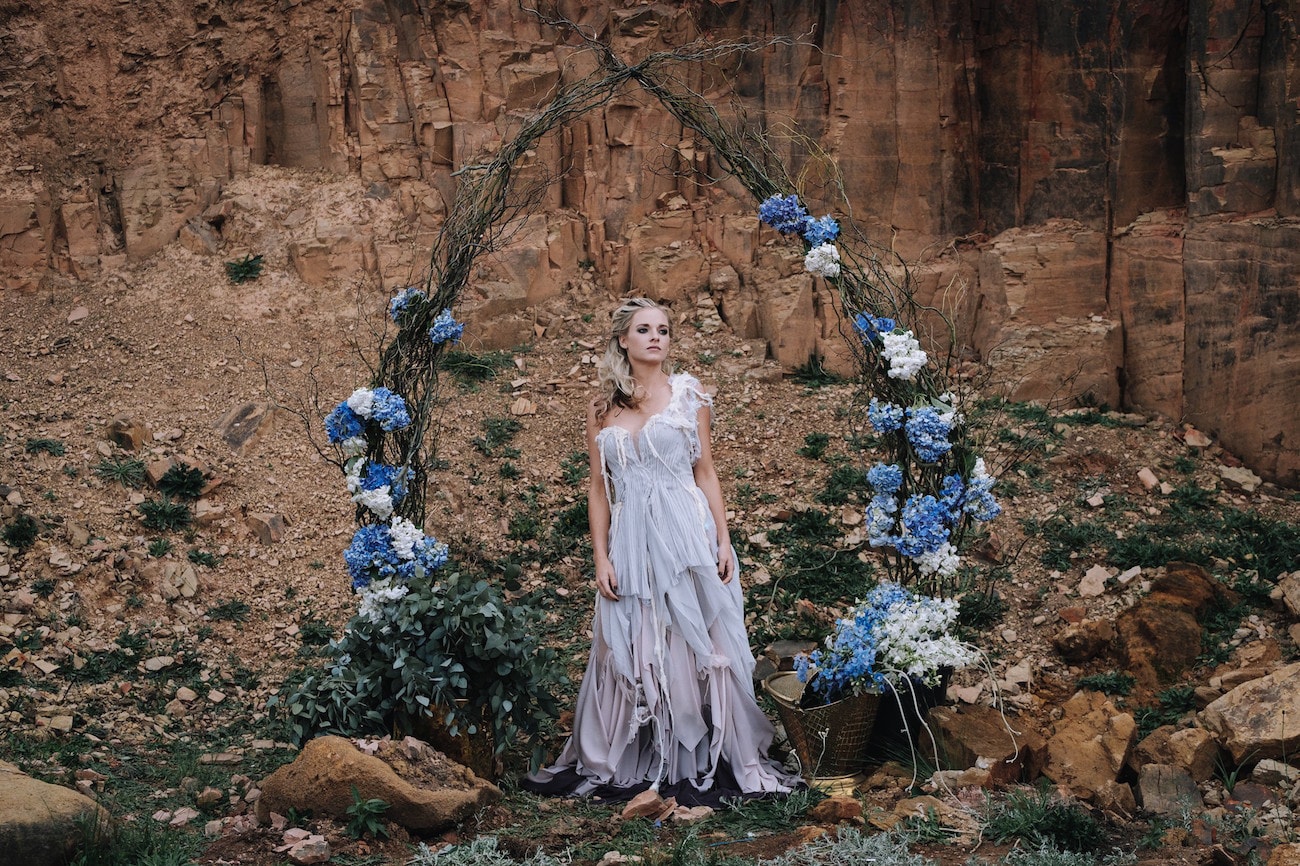 “You had me at alpacas.” That’s what I told Stacey of The Shank Tank when she sent over this uniquely gorgeous styled shoot that combines wild, natural elements and dramatic scenery. It’s a little otherworldly, like a visit to another planet, but combined with that atmospheric strangeness is some seriously beautiful and inspiring inspiration, from gowns to table decor, stationery to hair and makeup, and a gold dripped cake for extra yumminess. And the flowers… oh my. SBB faves Natural Nostalgia were absolutely in their element here with a loose, wild bouquet arrangement, pastel-with-an-edge table arrangements, and a floral arch that is just boho perfection. Plus there’s ALPACAS. You can’t get cooler than that!