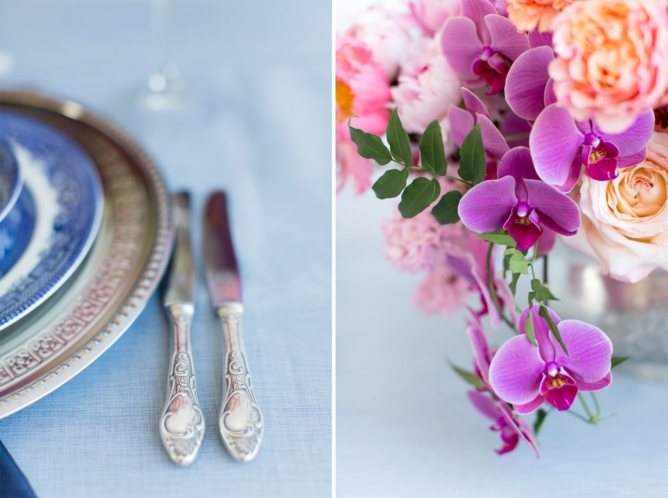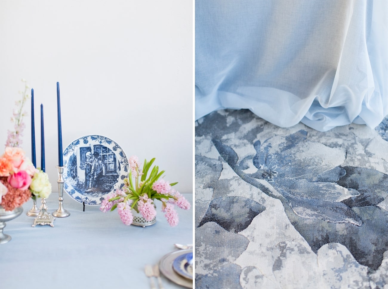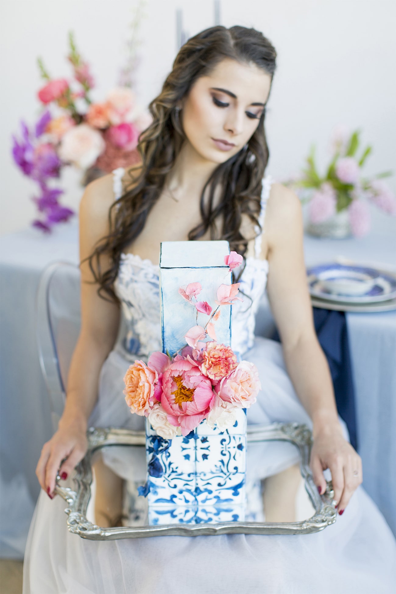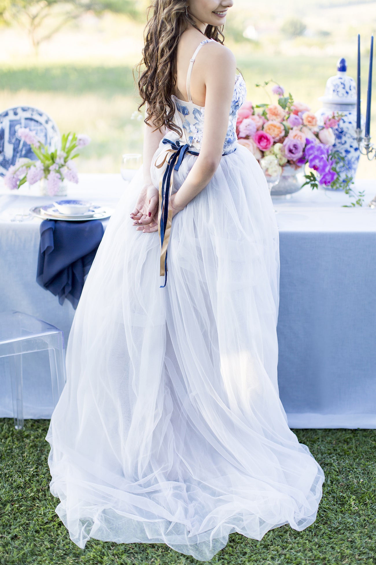 Our inspiration was creating a modern spin on an old fashioned theme and a look that was modern yet soft and romantic, with just a touch of vintage. The colour scheme we used was Delft blue, antique silver and shades of blush. Key elements included: Nederland and Chinese Delft, Victorian silver cutlery, brushed silver, navy blue candles and napkins, a sky blue tablecloth, Delft stools mixed with ghost chairs, and a floral carpet. We used flowers like orchids, peonies, hydrangea, and roses. The bodice of the dress, which was designed, made and hand-painted by Preez, was also Delft-inspired.