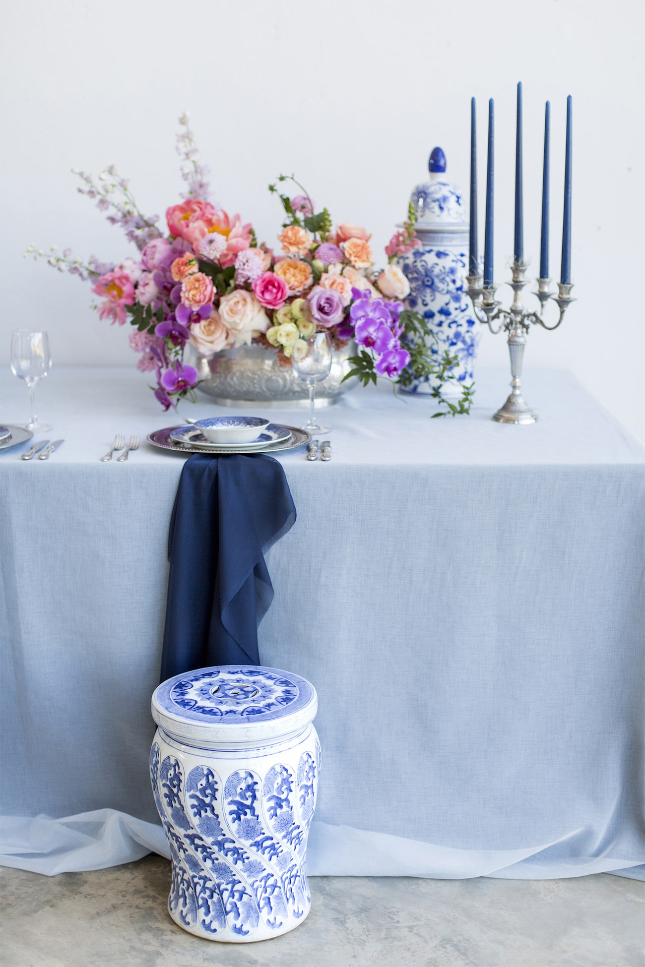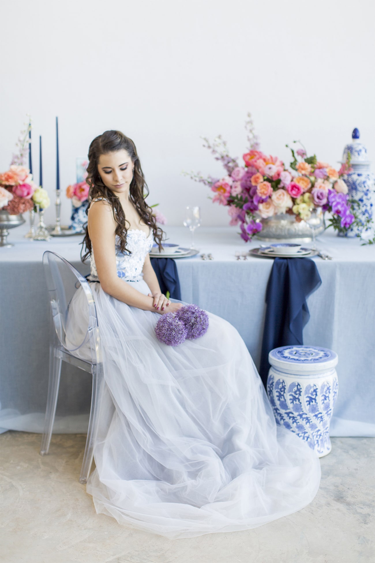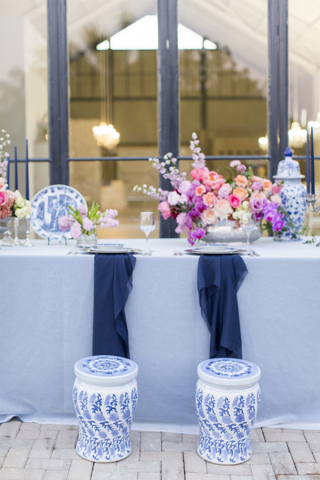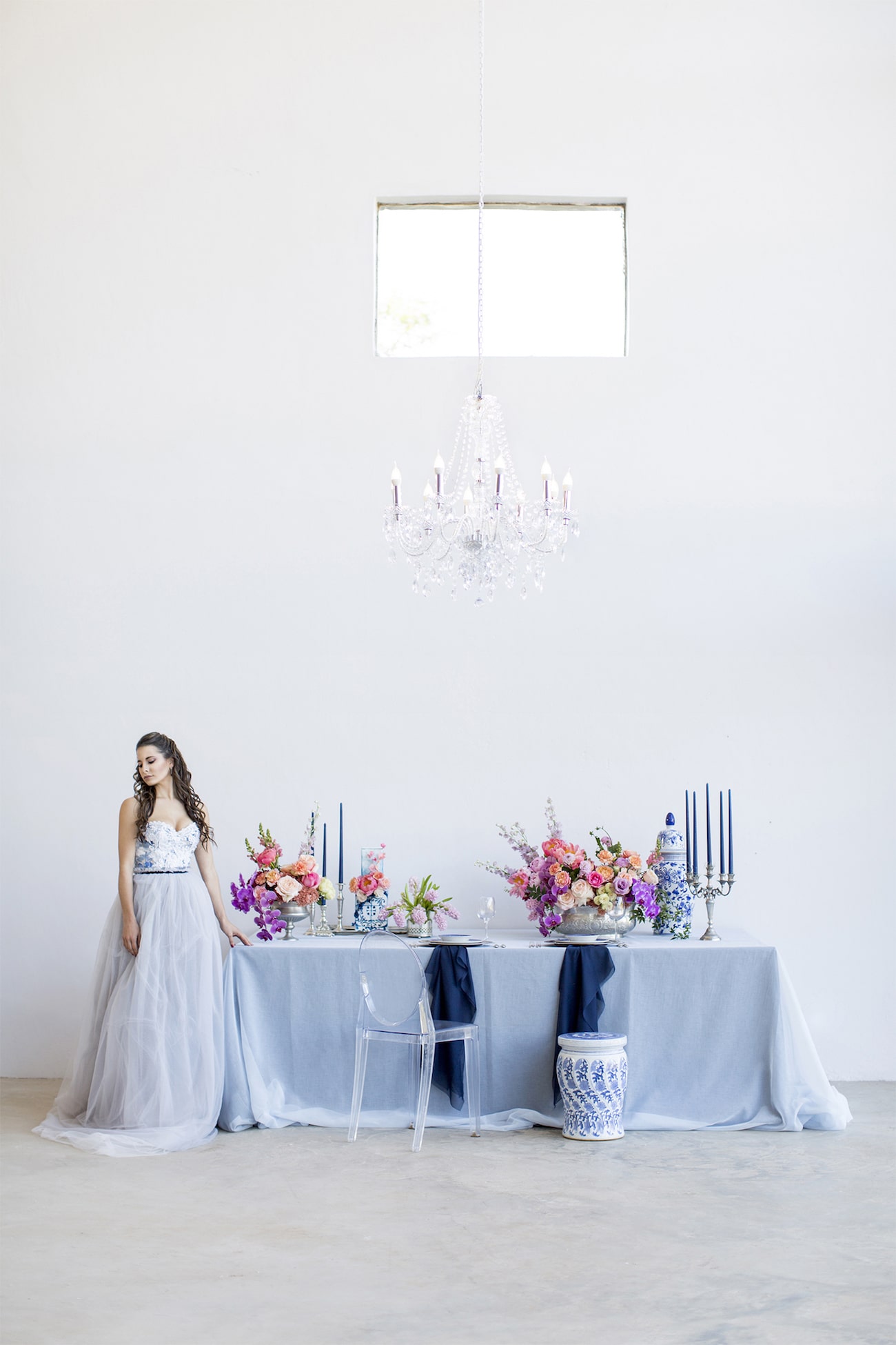 Our inspiration was creating a modern spin on an old fashioned theme and a look that was modern yet soft and romantic, with just a touch of vintage. The colour scheme we used was Delft blue, antique silver and shades of blush. Key elements included: Nederland and Chinese Delft, Victorian silver cutlery, brushed silver, navy blue candles and napkins, a sky blue tablecloth, Delft stools mixed with ghost chairs, and a floral carpet. We used flowers like orchids, peonies, hydrangea, and roses. The bodice of the dress, which was designed, made and hand-painted by Preez, was also Delft-inspired.