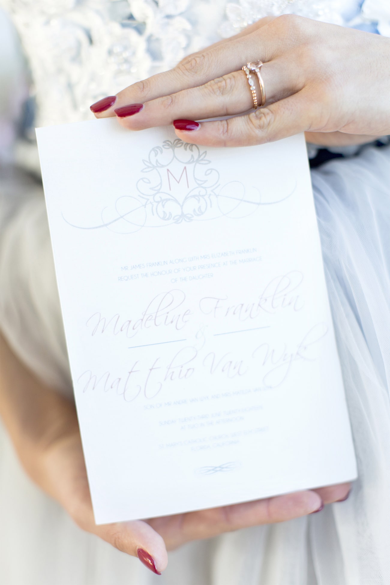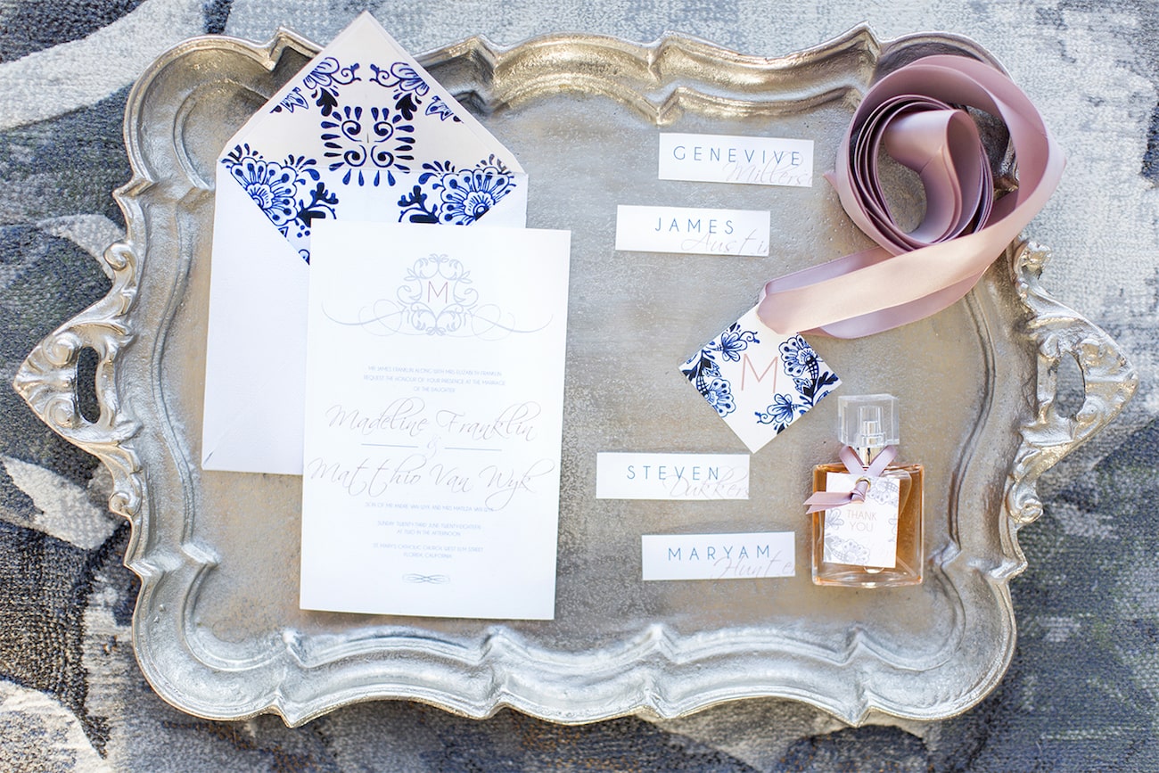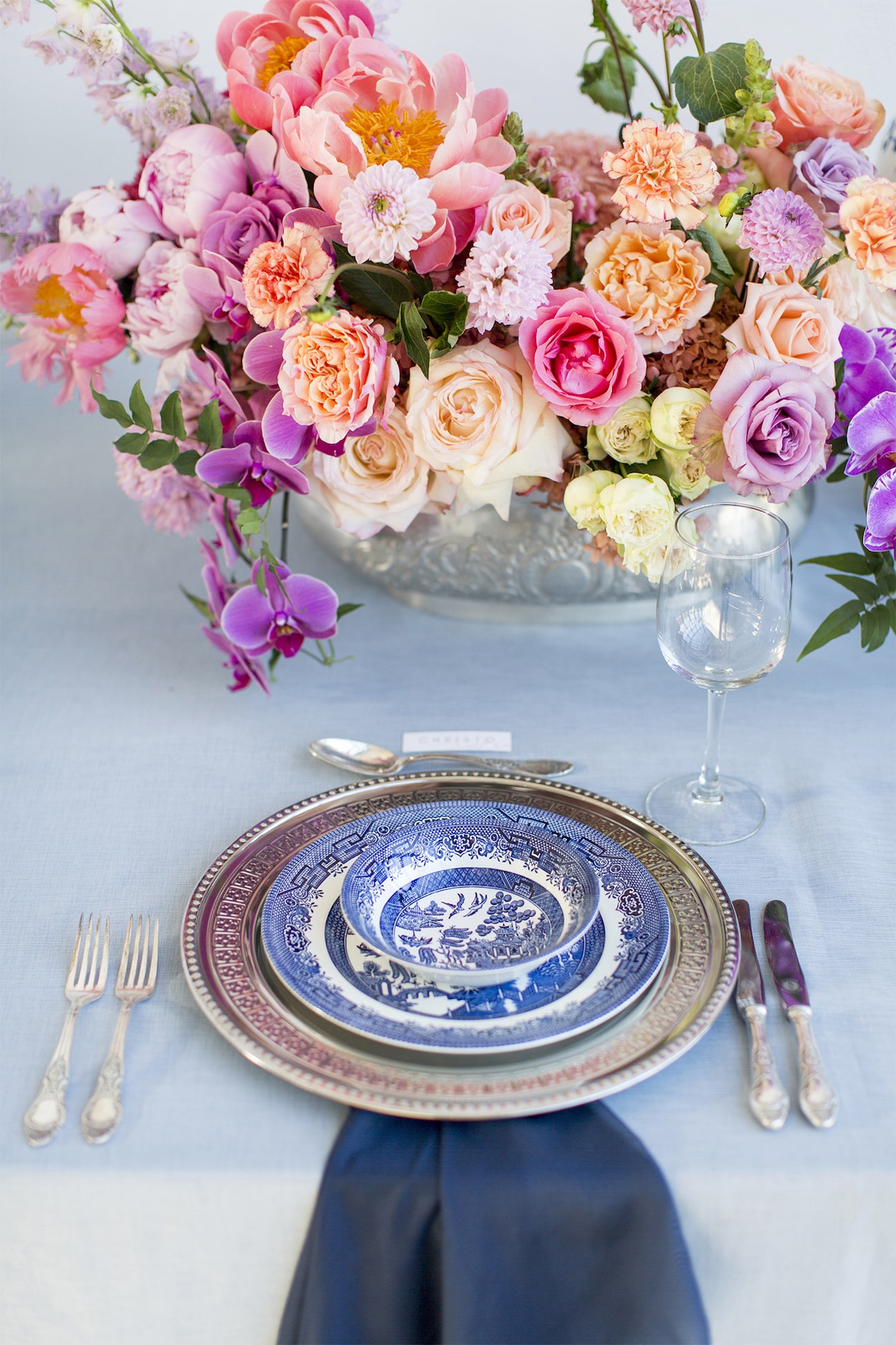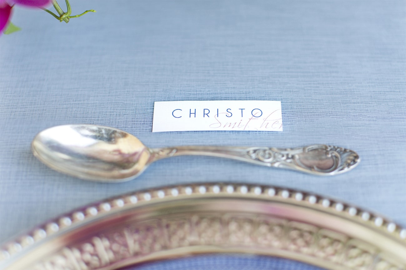 Our inspiration was creating a modern spin on an old fashioned theme and a look that was modern yet soft and romantic, with just a touch of vintage. The colour scheme we used was Delft blue, antique silver and shades of blush. Key elements included: Nederland and Chinese Delft, Victorian silver cutlery, brushed silver, navy blue candles and napkins, a sky blue tablecloth, Delft stools mixed with ghost chairs, and a floral carpet. We used flowers like orchids, peonies, hydrangea, and roses. The bodice of the dress, which was designed, made and hand-painted by Preez, was also Delft-inspired.