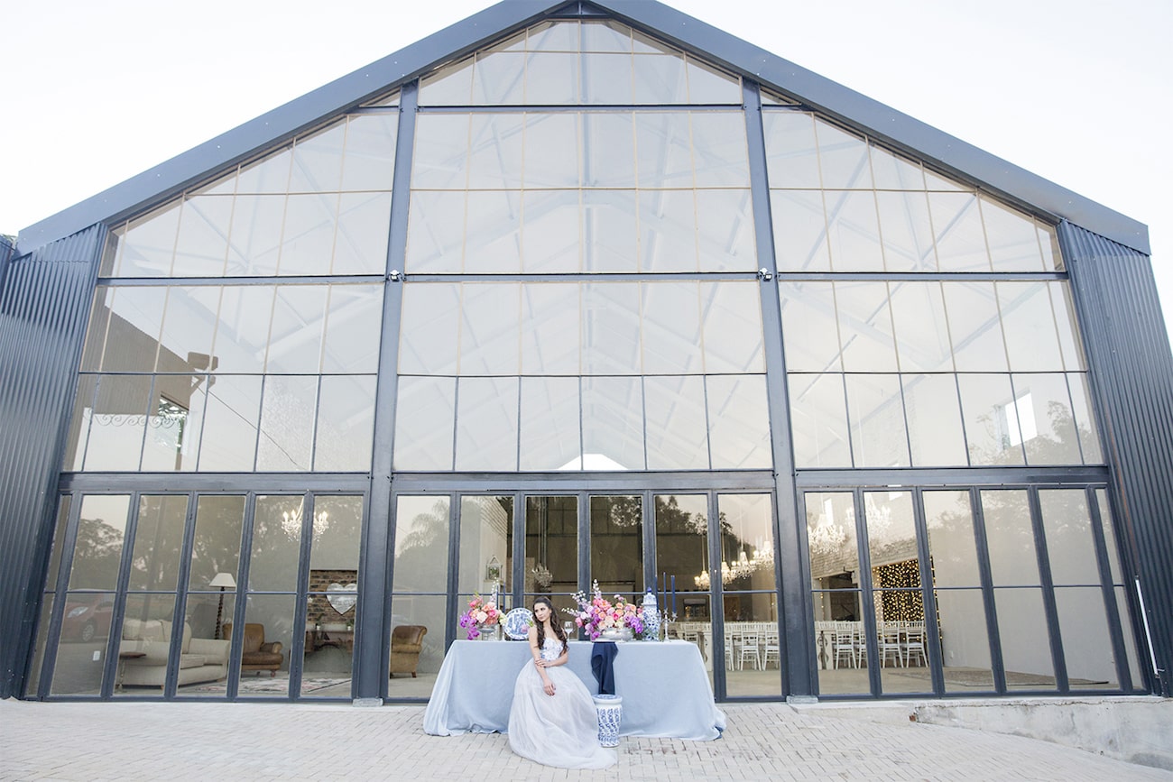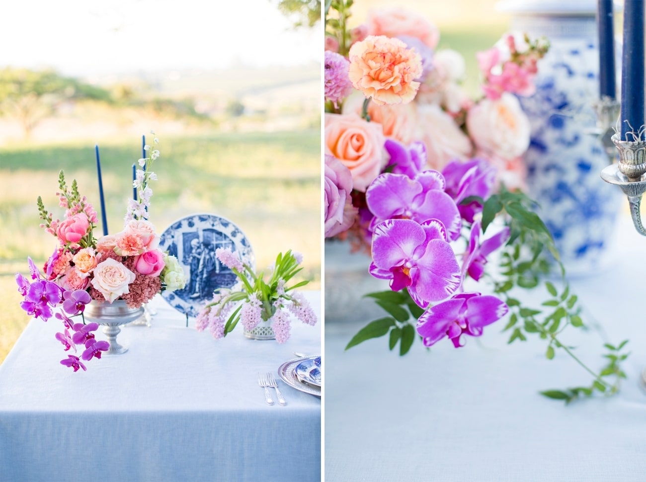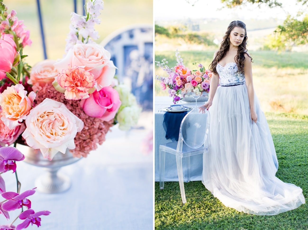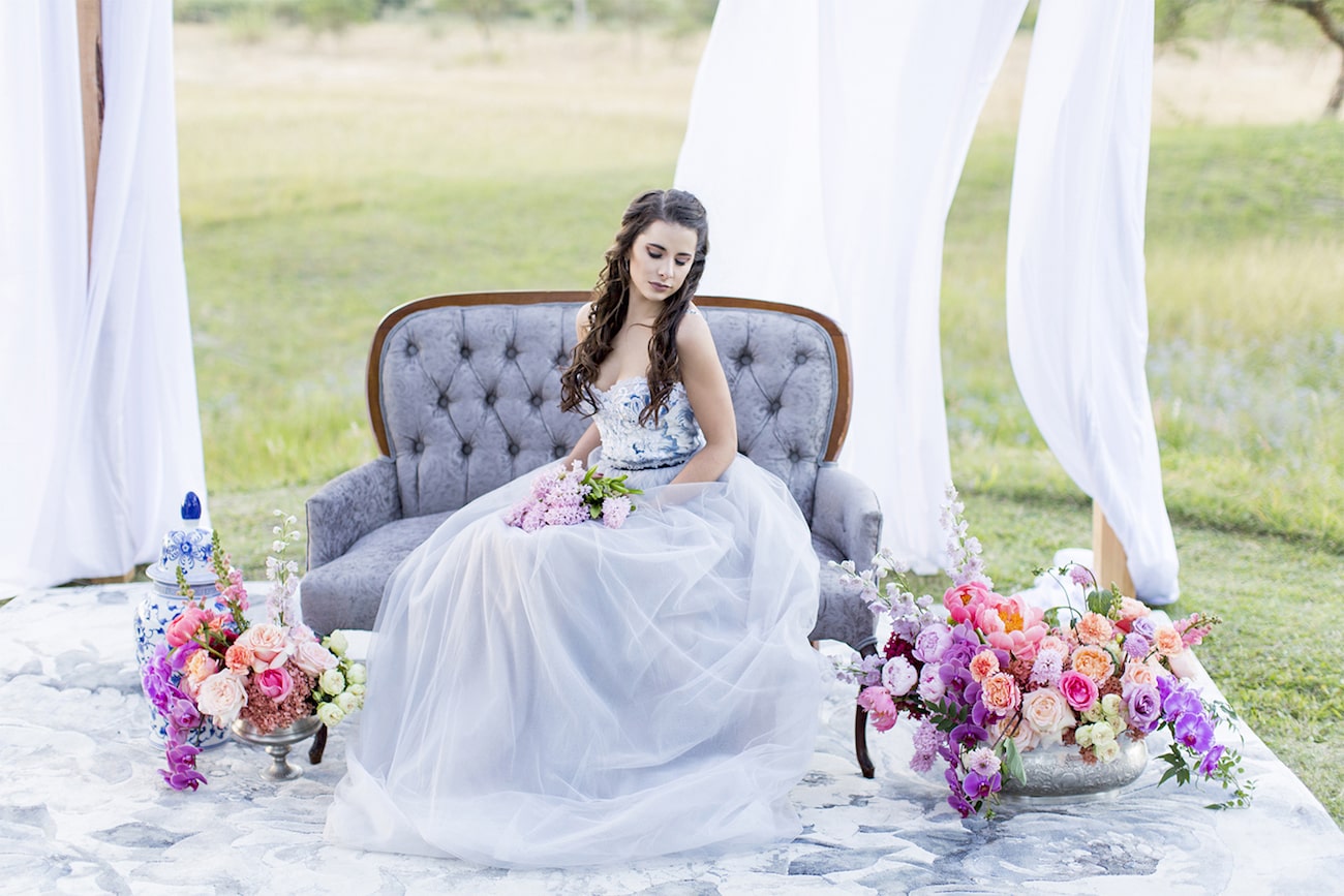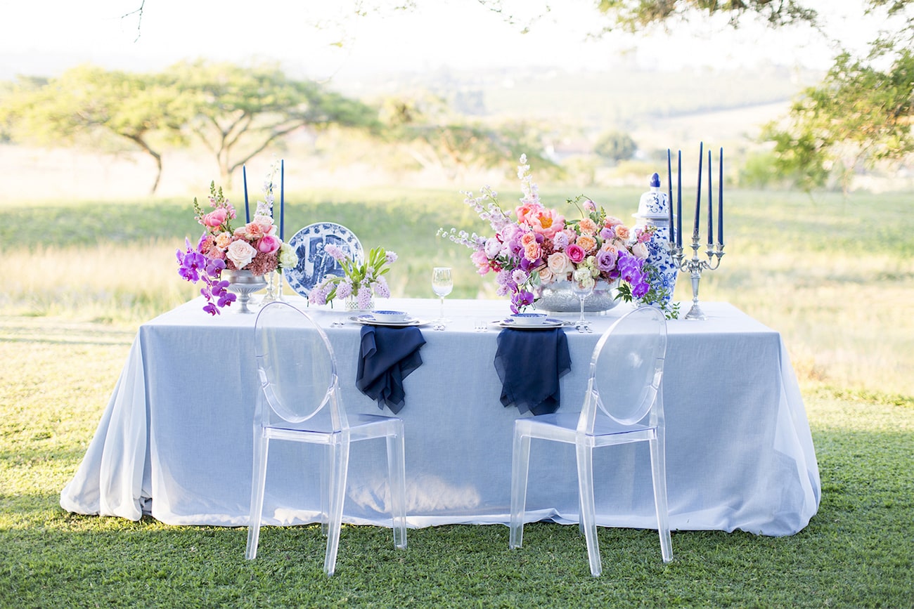 Sometimes I get a shoot in my inbox that just speaks to me, and today’s feature is very much one of those. Anyone who knows me will tell you I am crazy for anything Delft or Delft-inspired, and I LOVE seeing Delft pop up in wedding design. That very particular Delft blue is such a gorgeous shade, and it adds something really special (and very South African) to a table design. It can be played down, but my favourite is when the china is paired with big, bold blooms. In this shoot (put together by a talented team led by Marné of Marné Photography, NOVA Events, LUSH Signature Floral Styling, and Whispering Thorns), the blue and white tableware is placed with big blousy coral and pink peonies, bright purple orchids, lush peach roses, and more. It’s beyond gorgeous! The vibe is modern meets vintage with both contemporary and heirloom touches, and some amazing Delft-inspired touches like the hand-painted wedding dress and the fabulous cake. Basically, I’m in Delft heaven!