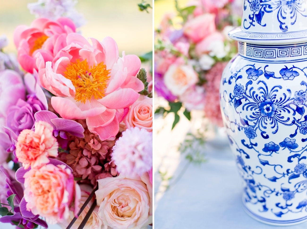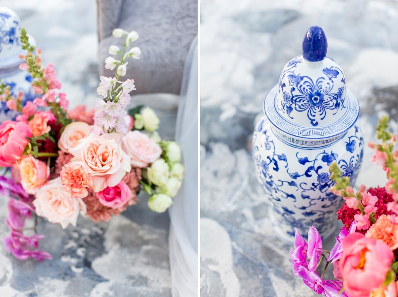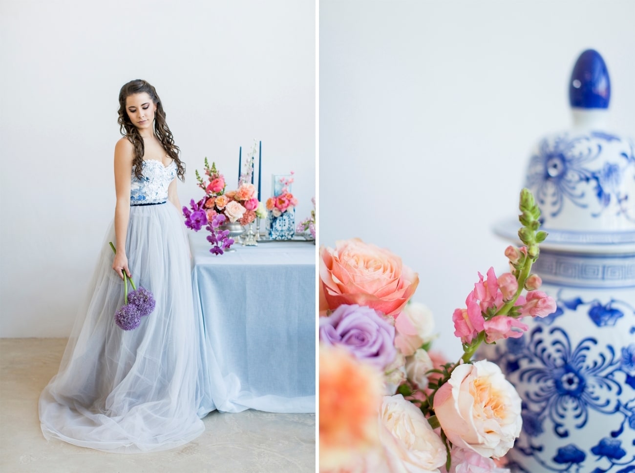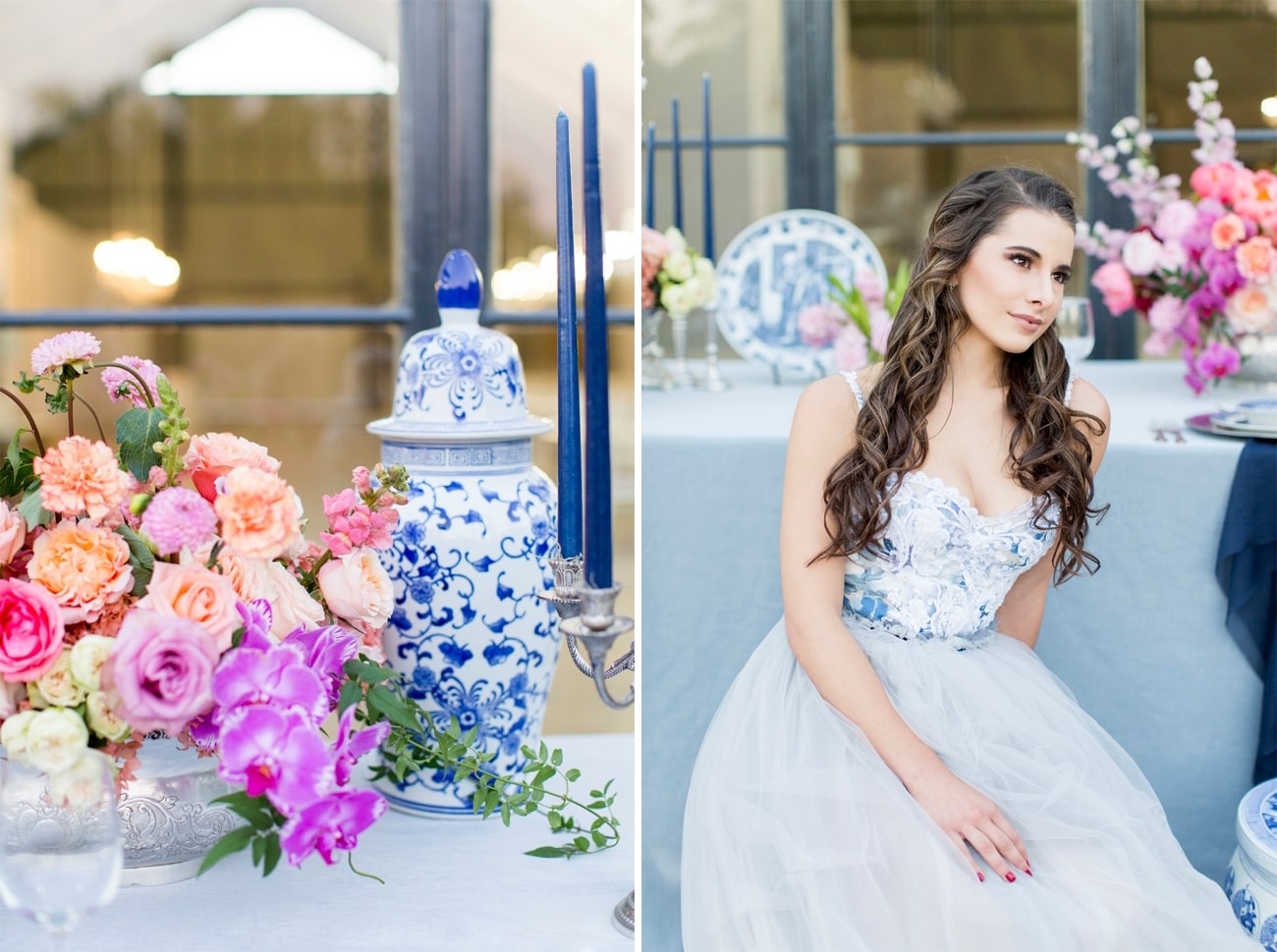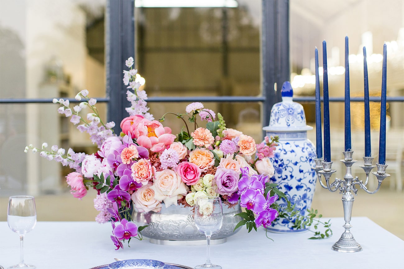Sometimes I get a shoot in my inbox that just speaks to me, and today’s feature is very much one of those. Anyone who knows me will tell you I am crazy for anything Delft or Delft-inspired, and I LOVE seeing Delft pop up in wedding design. That very particular Delft blue is such a gorgeous shade, and it adds something really special (and very South African) to a table design. It can be played down, but my favourite is when the china is paired with big, bold blooms. In this shoot (put together by a talented team led by Marné of Marné Photography, NOVA Events, LUSH Signature Floral Styling, and Whispering Thorns), the blue and white tableware is placed with big blousy coral and pink peonies, bright purple orchids, lush peach roses, and more. It’s beyond gorgeous! The vibe is modern meets vintage with both contemporary and heirloom touches, and some amazing Delft-inspired touches like the hand-painted wedding dress and the fabulous cake. Basically, I’m in Delft heaven!