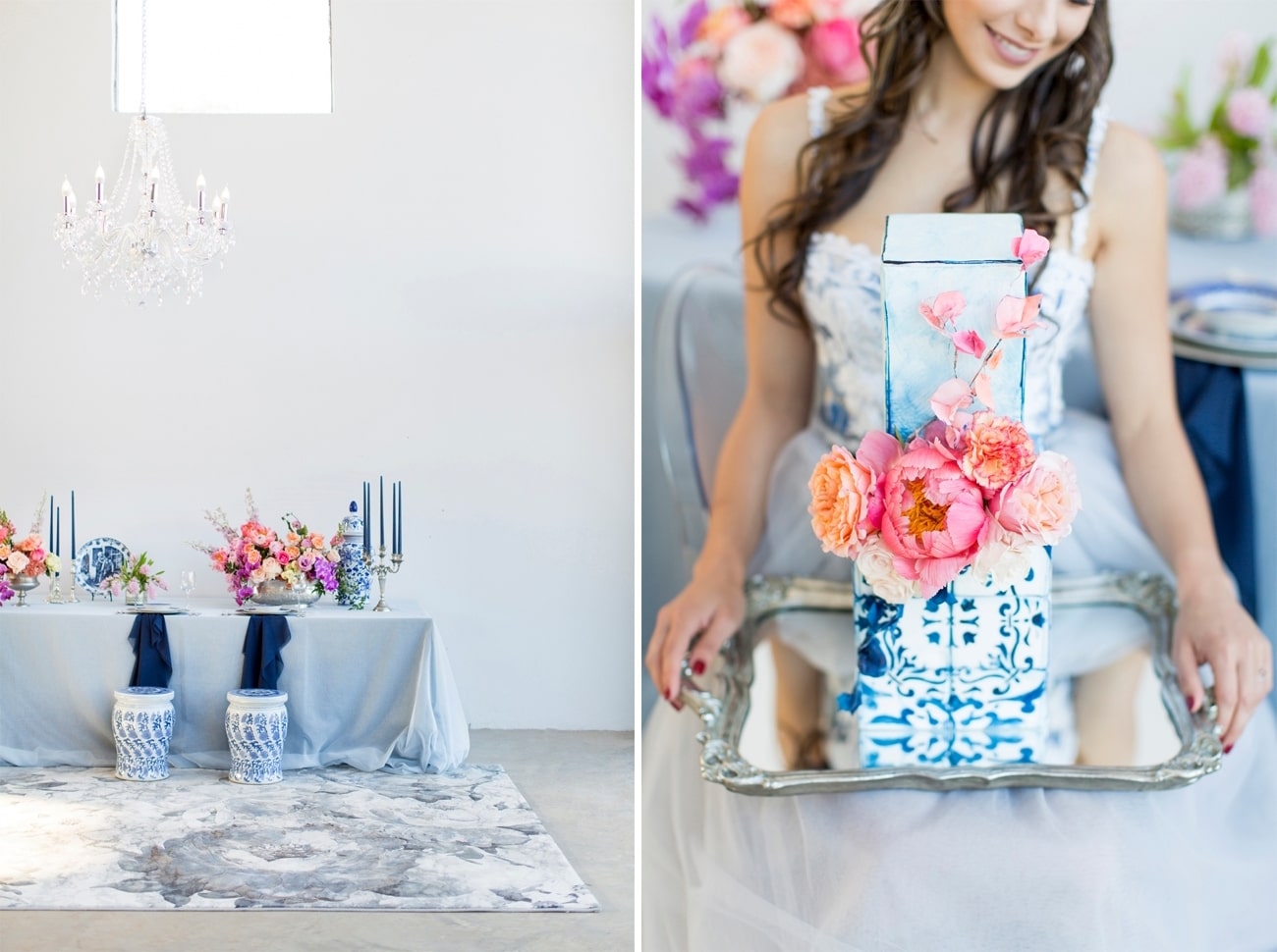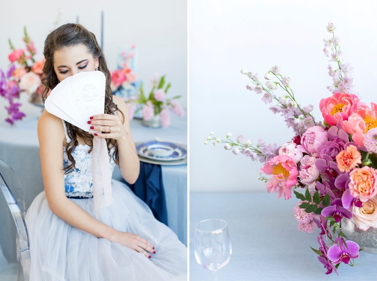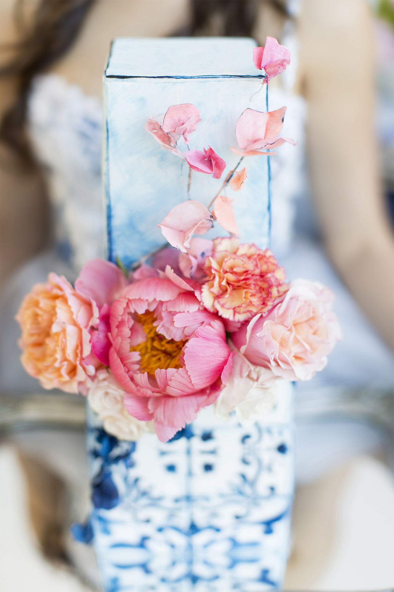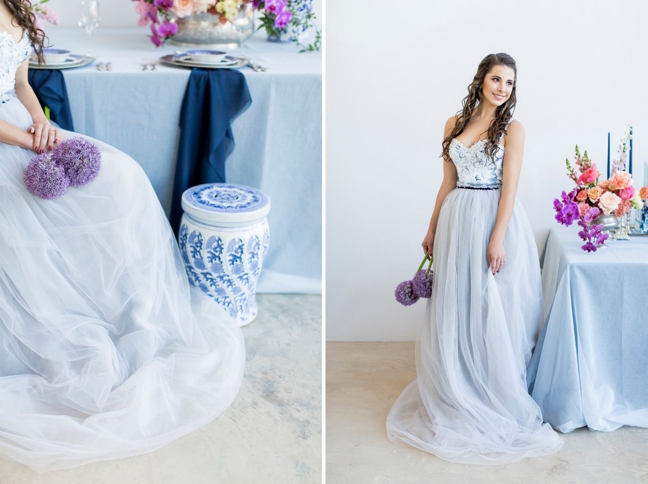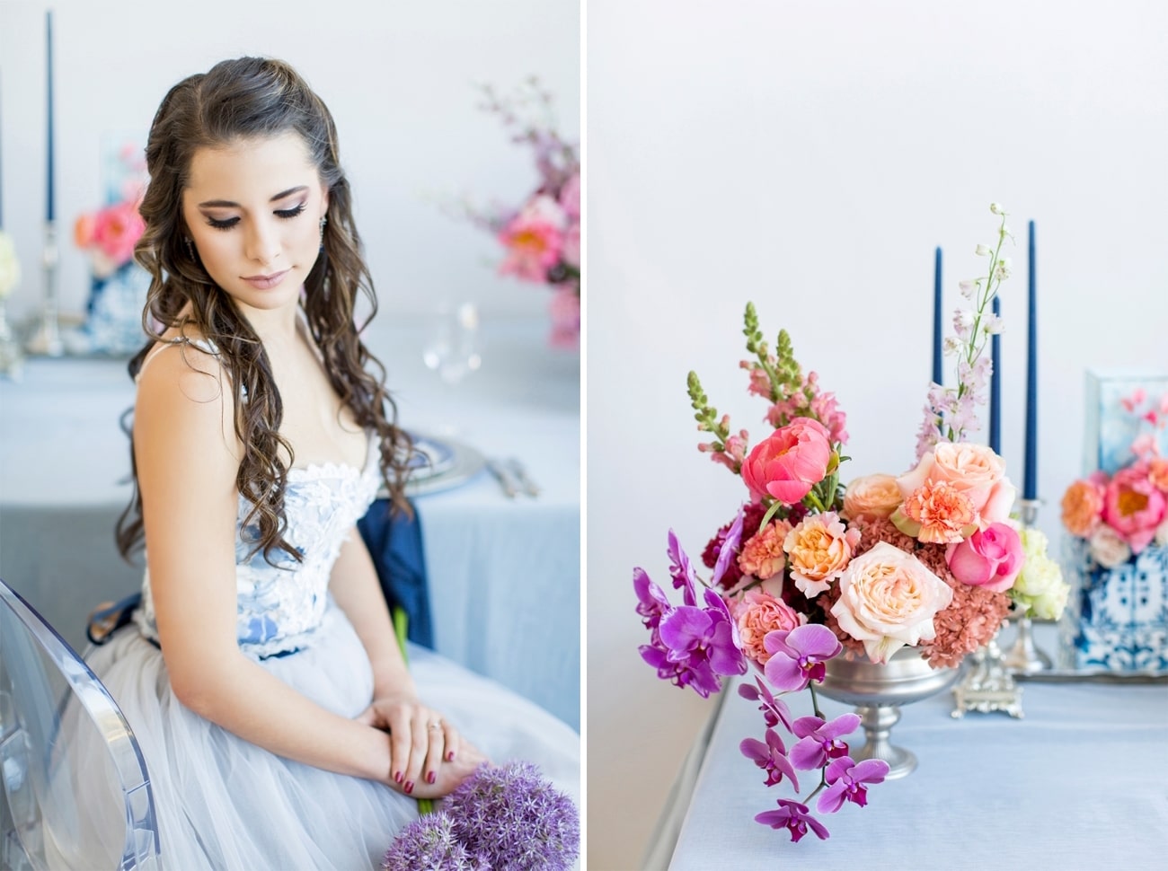 Sometimes I get a shoot in my inbox that just speaks to me, and today’s feature is very much one of those. Anyone who knows me will tell you I am crazy for anything Delft or Delft-inspired, and I LOVE seeing Delft pop up in wedding design. That very particular Delft blue is such a gorgeous shade, and it adds something really special (and very South African) to a table design. It can be played down, but my favourite is when the china is paired with big, bold blooms. In this shoot (put together by a talented team led by Marné of Marné Photography, NOVA Events, LUSH Signature Floral Styling, and Whispering Thorns), the blue and white tableware is placed with big blousy coral and pink peonies, bright purple orchids, lush peach roses, and more. It’s beyond gorgeous! The vibe is modern meets vintage with both contemporary and heirloom touches, and some amazing Delft-inspired touches like the hand-painted wedding dress and the fabulous cake. Basically, I’m in Delft heaven!