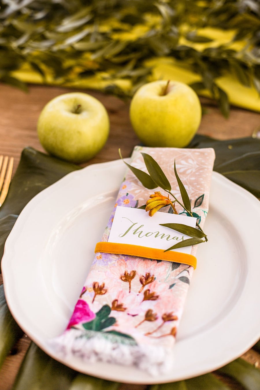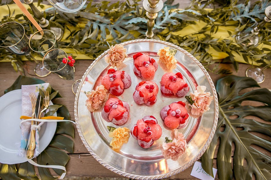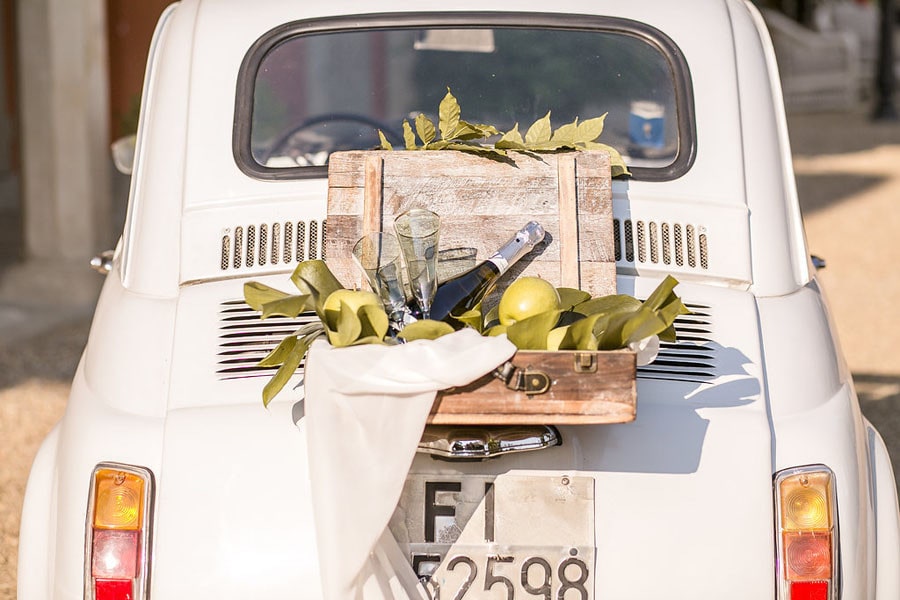 We wanted to create a rustic, warm mood using many neutral colors such as yellows, greens, browns, and reds, with the reddish shade popping and standing out. The table, the flowers, the table setting and even the venue stayed consistent with this color theme, and the bridal car and cake matched the theme of this day. The table setting was breathtaking and was located on the edge of the property with a view of the gardens and the city of Florence. The table was wooden and rustic, and was surrounded by simple brown wired chairs. The table was of course decorated, a long pale yellow cloth was draped along the middle of the table, and on top of this cloth was a green runner with many green leaves coming from it. In front of each chair you could find a simple white plate placed on top of a large green leaf. In the middle of each plate was a colorful napkin with a green leaf. On the side of each plate we placed two gold forks along with a silver knife all tied together with a ribbon. Three glasses with gold rims for each guest were also provided with small cherries lying on top. The table also contained thin white candles as well, and small green apples. Bright red strawberry desserts were also present in this shoot, just as mentioned before this was the red color that ‘popped’.