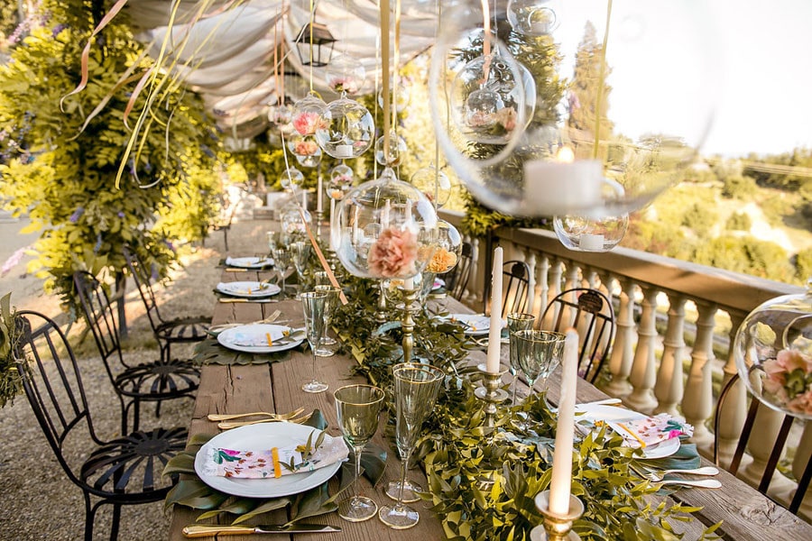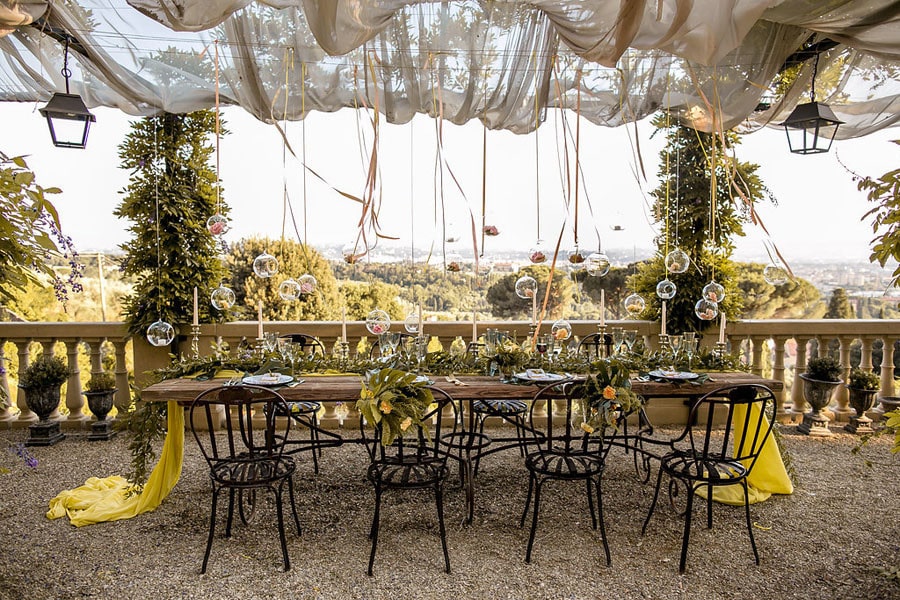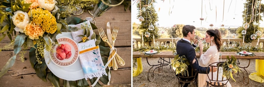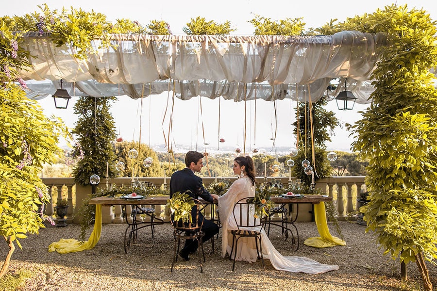 Every time I see pictures of Italy (anytime, but especially right now since I have a flight booked in May) all I can think is: TAKE ME THERE. Like, right now. Those of you who have been reading SBB for a while (and anyone who’s ever been around me during the soccer world cup LOL) will know that I’m proudly half Italian, and so the minute this dreamy romantic shoot at a villa looking over the city of Florence crossed my desk I was in LOVE. Can you imagine? The Villa Le Fontanelle includes the villa, a fortress and a beautiful garden in the grounds, and it made an incredible backdrop for this shoot. The talented team, led by planners The Tuscan Wedding, wanted to create a rustic, warm mood using neutral colors such as yellows, greens, browns, and reds. And it is warm, it’s inviting, it’s summery, and it’s oh-so-elegant. So let’s take ourselves there by diving into Storyett‘s dreamy pictures!