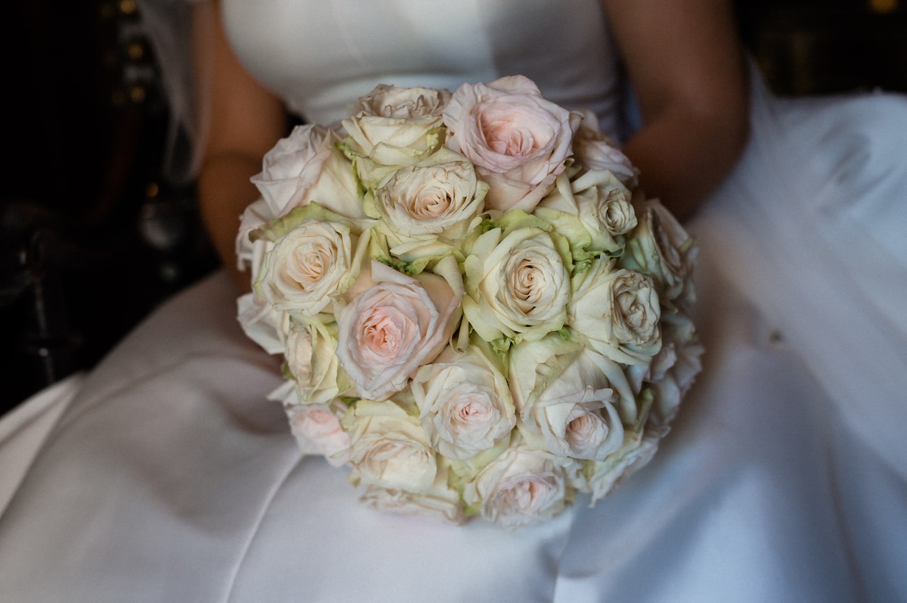 My favorite flowers are peonies but the logistics of the drought in Cape Town and the seasons not being right meant I had to find alternatives that were sustainable. I just wanted the same feel – large, round petal flowers in white surrounded by lush greenery runners – especially pennygum. For my bridesmaids and I, I wanted classic, round white rose bouquets – and the junior bridesmaids carried white rose flower balls.