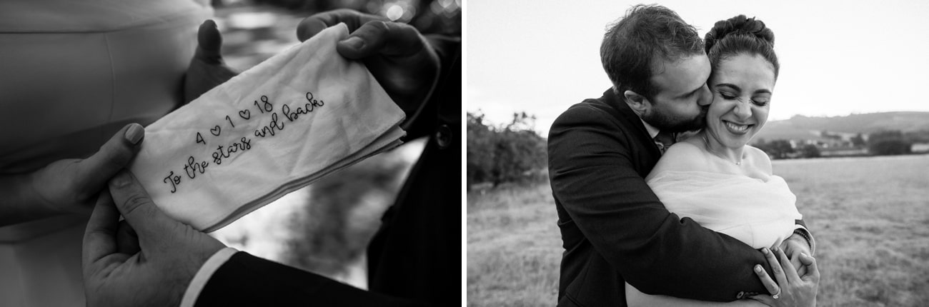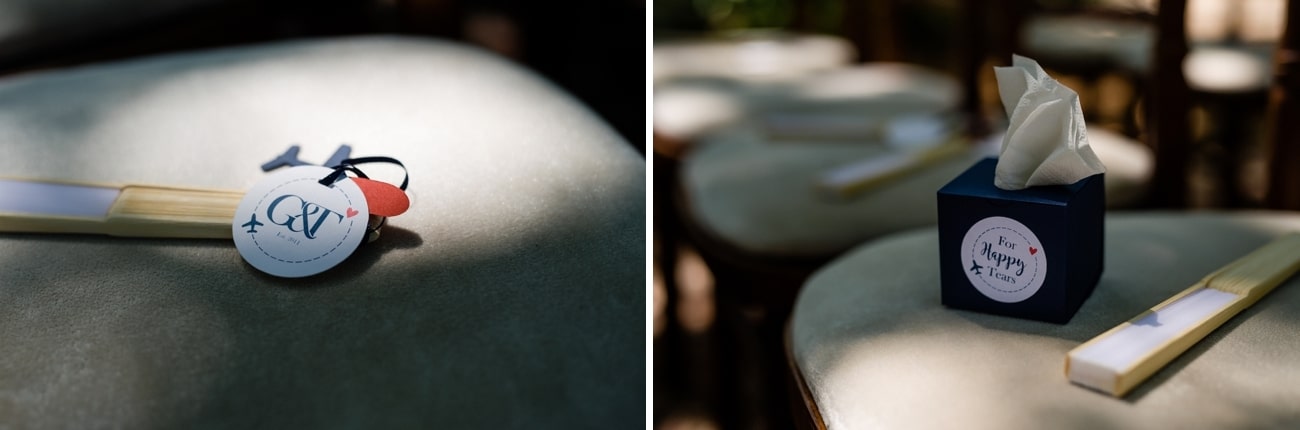 I’m very hands-on and a bit of a perfectionist so there were a lot of things that I wanted done just right. The biggest undertaking was hand-painting all of our wedding stationery, from the welcome sign and signature cocktail menu to our seating chart and tables names and place cards. I was painting up until the day before the wedding! My mom was incredible helping me to assemble all of the signs – most had 3D elements – where the images had to be stuck on thick double-sided tape to make them stand out, and threading all of the seating chart countries to their table tags! I absolutely loved doing it and it inspired me to start my own Etsy store creating custom art for other brides too! My father and husband dutifully folded, stuffed and labeled 90 ‘For Happy Tears’ tissue boxes, and attached ribbons, hearts and airplanes to over 100 silk fans. I also hand embroidered handkerchiefs for my husband and our parents to use on the day with personal messages from me. In a way, even my dress and veil were DIY – my mum, my gran and my gran’s sister (all exceptional seamstresses) handmade my veil and adorned it with hundreds of tiny pearls, and added the soft tulle collar that finished off my wedding dress. Every element was made with love.