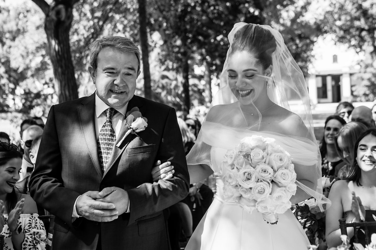 Just after the ceremony, we were processing back up the aisle towards the manor house where we were going to sign the register. We had passed all of our guests and the photographers had put down their cameras, and it was just Greg and I our bridesmaids and groomsmen walking in a line up the brick lane and Greg said “I just need a second”, and he suddenly stopped, bent over and started crying. The maid of honor and best man sort of bumped into him and this domino effect happened with all of the bridesmaids and groomsmen behind them. He’d been so emotional during the ceremony and had been holding it together but he just needed that moment to let out all of that pent up emotion. It was so real and so honest. And then we hugged and laughed about it and carried on. Having my dad ‘give me away’ was another really powerful moment. He whispered something in my ear – our secret – and it was probably the most emotional I got during our ceremony. I’m very close to my dad so that was really special.
