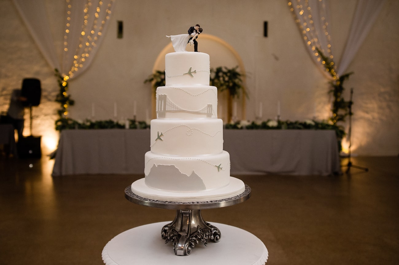 Our initials are G&T and it is our favorite drink so we had a signature cocktail bar with three recipes using Tanqueray (our go-to) and two South African gins, Inverroche Amber (paired with honey & mint) and Cape Town Classic Dry Gin (paired with cucumber and lime). I loved that our guests were able to socialise over the cocktails and compare favourites. Of course, our travel theme was a lot of fun to play with – finding the little steel pushpins shaped like aeroplanes for the seating chart, and Greg’s aeroplane socks. I loved creating our little monogram with the plane and the heart, and trying to find subtle ways to include the motif in our decor. And our cake, of course, featuring our two favourite places – Cape Town and New York – with aeroplane trails and hearts. Our cake topper was a groom dipping a bride, which was an echo of our first kiss.