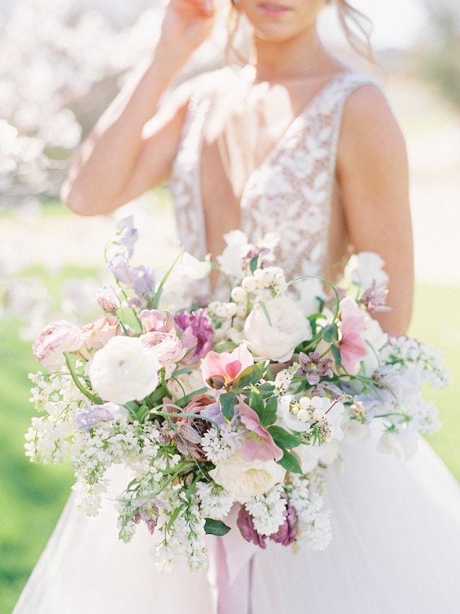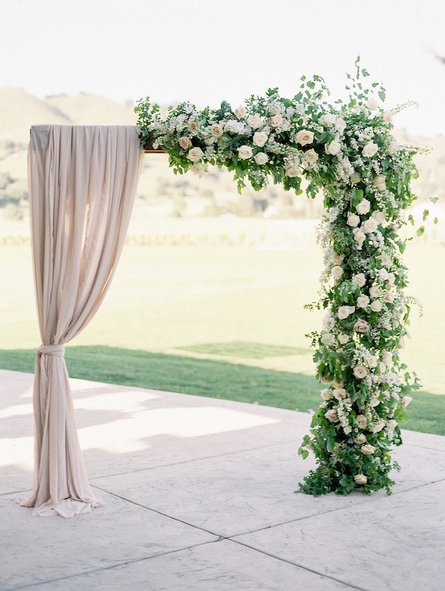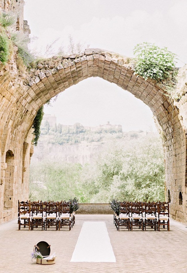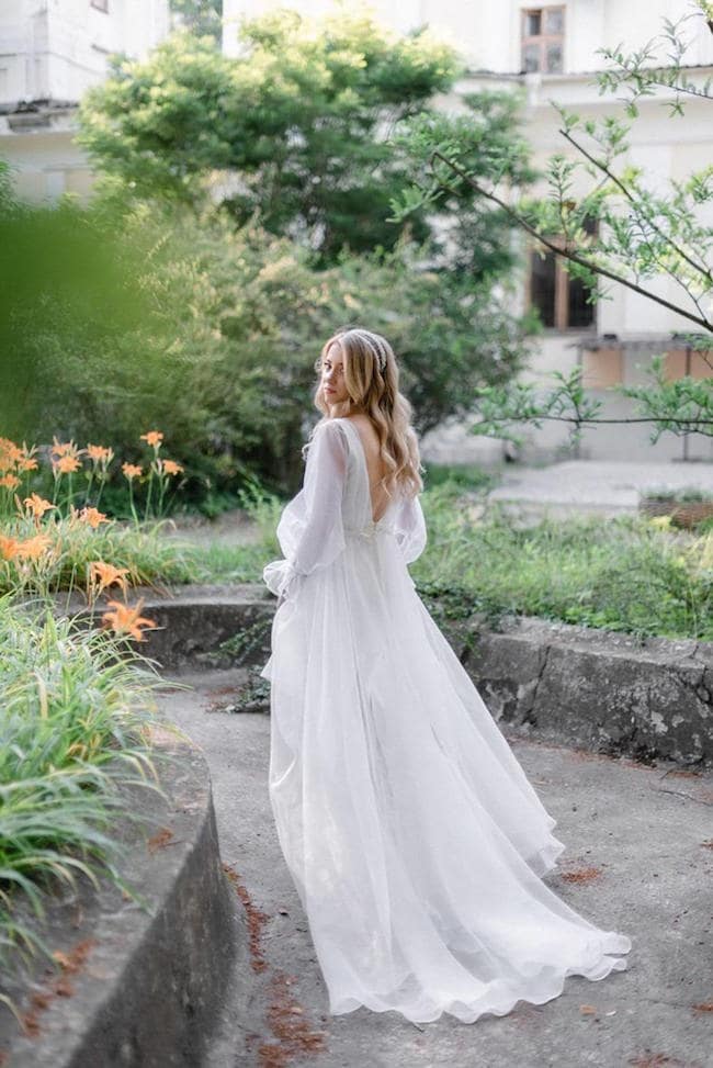 Light-as-air puff sleeves are the perfect look for a romantic bride right now, and this gorgeous dress from Etsy also has a long, airy train that makes me want to run barefoot through a secret garden (as you do). Plus it’s a convertible dress with a fitted satin midi beneath the ballgown, so you have a built-in afterparty or reception dress. (It’s also a superb option if you’re having two weddings thanks to COVID and need a minimony dress as well as a gown for your sequel wedding.) I immediately picture this at a spring or summer wedding filled with soft blooms, watercolour prints, and fine art wedding detailing. I’ve combined Marissa, a lovely printable wedding invitation from Etsy, with a handpainted cake, silk bridesmaid gowns with flutter sleeves, a draped floral ceremony arch, and lots of beautiful flowers of course! Pretty much obsessed with this romantic look, don’t you agree? (If you do, then you’ve found your bridal style!)
