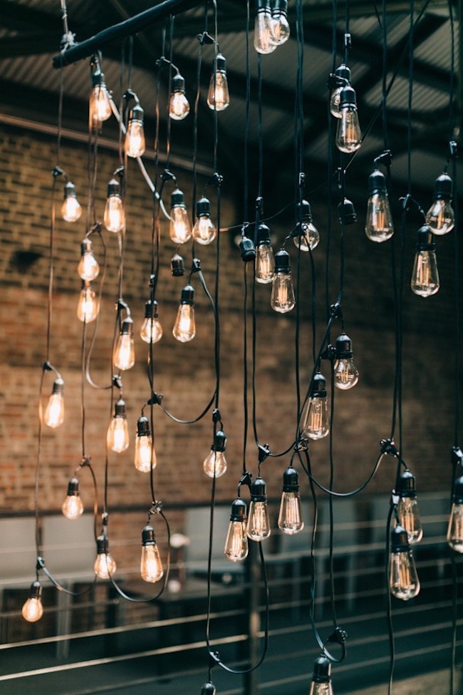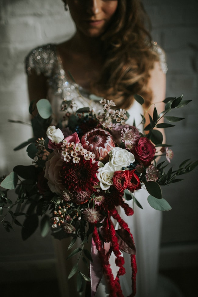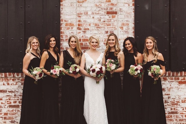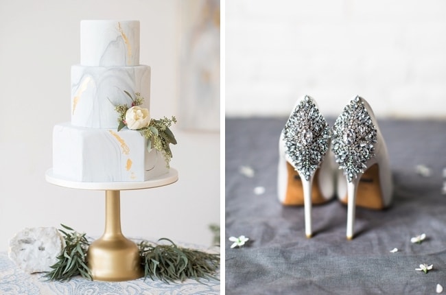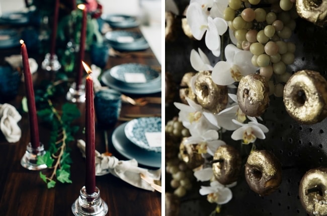 I do love a jumpsuit for a city chic bride! So stylish, flattering, and comfortable too. The Vasilisa bridal jumpsuit comes with a feminine lace top and a sweet chiffon bow at the back. I’ve paired it with a dark and moody urban palette in shades of pewter, marsala, red, black, gold, and deep emerald green. Be sure to balance industrial elements like Edison bulbs with more romantic ones, like soft blooms and candlelight, and choose elegantly modern minimalist stationery (love this black and white typography one from Etsy!) What to serve instead of traditional cake? How about glittery gold donuts. Now that’s a feature that will have your guests talking!
