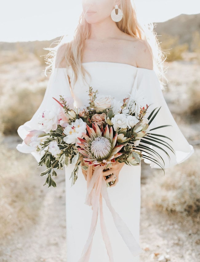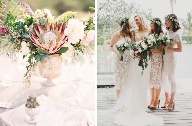 Finally, meet gorgeous Barcelona from indie bridal brand, Wear Your Love. I’ve chosen to pair it with the desert bohemian wedding style which is super on-trend. The gorgeous lace is ideal for a free-spirited bride, whether she’s having a wedding that’s relaxed and outdoors, or has chosen the boho glam look. I love this style paired with a dried floral invitation suite, boho florals like proteas, pampas grass, and succulents, lace bridesmaid dresses, and a delicate boho bridal hairpiece.