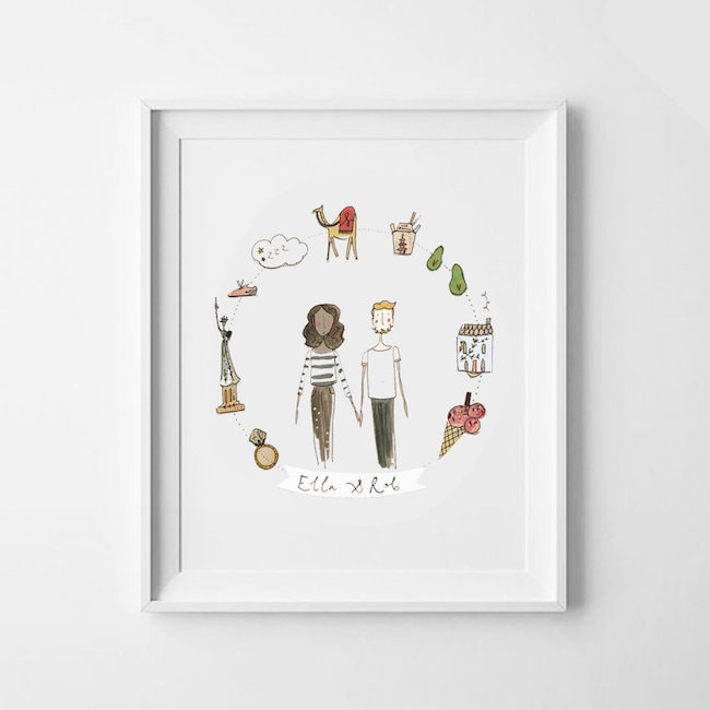 Custom artwork is always a lovely gift, and I absolutely adore artist Nora Wright’s style. The ‘Story of Us’ portrait includes the couple, a banner with their names or date, and the cutest little illustrations of things they love or that are special to them. This is sure to be treasured for years to come.