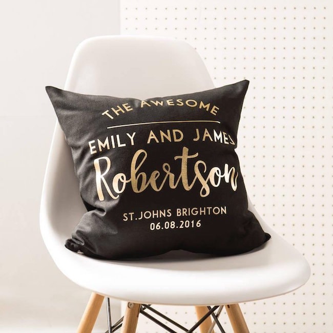 Custom cushions are another lovely personalised gift, and I really like these black and gold ones. This would make a great addition to the newlyweds’ lounge or bedroom!