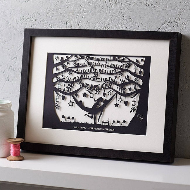 Here’s another lovely custom artwork option, this time a whimsical papercut featuring the couple’s names and the quote: ‘You know you’re in love when you can’t fall asleep because reality is finally better than your dreams’.