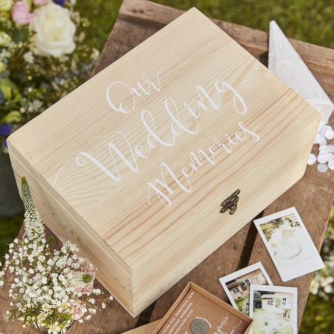 A couple’s wedding album is of course their most precious memento from their wedding day, but there are often many other tangible 3D reminders that they want to keep – a letter, a swatch of lace, a garter, a something blue. This wooden memory box is super pretty and will allow all those lovely memories to be stored in one place.