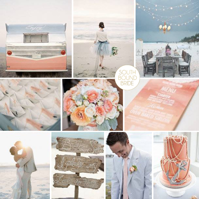 Happy Monday friends! It’s a super exciting day here on SBB, as later on we’ll be announcing the finalists for our first ever styled shoot competition. But first, it’s time for some inspiration of our own with the Monday moodboard. Today I’m loving coral (a colour trend that just keeps on going!) mixed with a cool, pale blue – a lovely fresh take on this colour combination and perfect for a laid-back beach celebration (or any celebration, really!). Reflecting the colours of the beach at sunset, it’s the perfect was to kick off a dusky ceremony and a dinner under the stars.