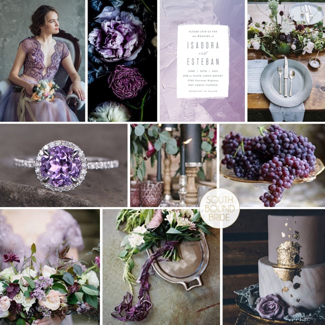 Top row (l-r): Purple lace wedding dress (Li Bright Wedding Dress) | Moody florals (Trine Hisdal) | Invitation (Minted) | Place setting (Lady Flashback)