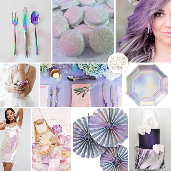 So this month, our editorial theme is ‘Cosmic Love’, and we’ll be using it to explore all things celestial wedding, but linking it at the same time to the latest development in the Pantone Color of the Year universe: Ultra Violet? Why, well, as Pantone themselves say: “Ultra Violet suggests the mysteries of the cosmos, the intrigue of what lies ahead, and the discoveries beyond where we are now… the vast and limitless night sky is symbolic of what is possible and continues to inspire the desire to pursue a world beyond our own”. I also love how Ultra Violet links to some otherworldly design elements, most notably iridescence, set to be a huge trend for 2018 (so expect to see some of that this month too, yay!). I think one of the key things about Ultra Violet is that it’s one of those colours that on its own can be… well, a little too much. It’s a great purple, but it’s still a bold colour and you don’t want to let it take over your wedding. But it combines beautifully with so many other shades: blues and greens, pinks, softer purples (maybe one of my favourite ways to use it), neutrals, pastels and berry shades alike. It lends itself to the current trend of having several colours (or tones) in your wedding palette, instead of playing mix and match. Plus, since you’ll find this shade in many flowers, I’m hoping that we’ll be seeing it in abundant florals the way Greenery did. Today we’re breaking down just a few of the options: a unicorn iridescent board suitable that is bang on trend, a softer country boho palette, a moody purple and grey number which I am loving, and a juxtaposition of purple versus bright red that really pops! Links in bold denote affiliate links. SBB may make a commission on any sales made.
