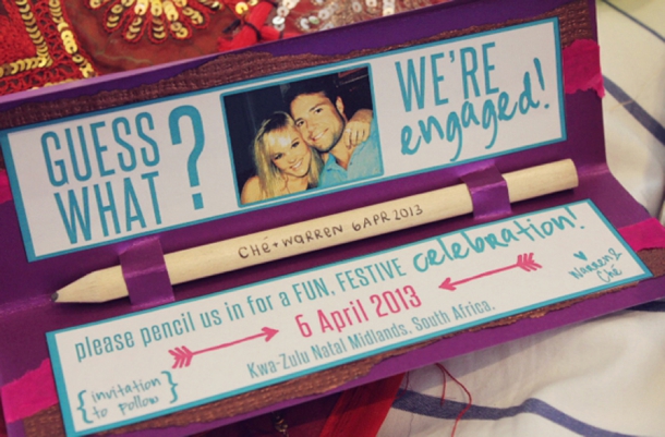 Oh we do love a DIY bride. And we especially love her when she’s our friend Che and she just happens to run a supercool South African blog called Indieberries, with cartoons and stuff. See, Che reminds me of my friend Marcelle. In Std 2, she pitched up at our school, and everything she touched turned to perfection. Her handwriting was awesome. She could draw. Her projects looked like professional scrapbooks. When she covered her compass tin with pictures it looked SO COOL (seriously, in the late ’80s that was a thing). She was like Regina George with the cutout t-shirt, but whenever I tried that stuff, it just looked ridiculous. So when Che got engaged, I knew that her guests would be treated to lots of creative, handmade, scrapbooky details that only she could put together, and I bought her wine and made her promise to send them to me. So here they are! Che’s Save the Dates are beyond cute – they’re based around the idea of ‘pencilling the date in’. I especially love that she wanted their guests to have something physical to open and use, like a present. Can you imagine getting one of these? You’d automatically be amping for the wedding, right? Anyway, you can read the thought behind these invites on Che’s awesome blog, or read on below for all the best Indieberries DIY tips. Oh, and pssst, if you’d like to read her and Warren’s story, see their adorable engagement shoot here.