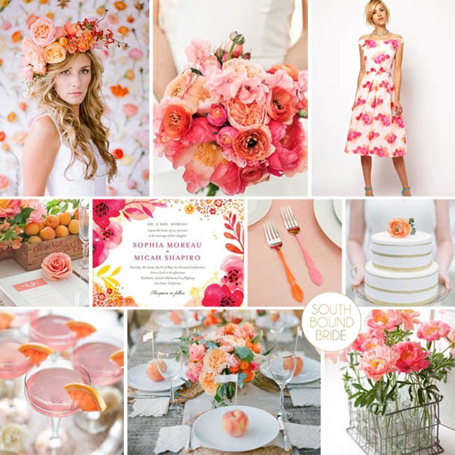 Sometimes I go through a phase where I do a bunch of more subtle and sedate inspiration boards, and I absolutely love working gentle or neutral tones and elegant, grown-up combinations. And then some days I just want to go mad and play with some colour. That’s today, and I have to tell you, I am loving the result. That’s the thing about using bold colour in your wedding- it adds a feeling of fun and happiness to the day, and there’s no reason why there has to be a trade-off in sophistication. Take today’s flower-filled inspiration board – big, bold punches of orange and fuschia and peach, with an underlying white to offset all of that colour. Modern, beautiful, and inspiring.