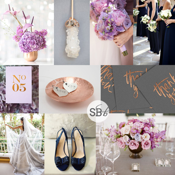 It’s hard to believe this year is already winding down (where did you gooooo, 2014?) and that it’s almost time for a new Colour of the Year to steal the Pantone crown. I’ll be sorry to see this year’s favourite, Radiant Orchid go – although of course, it won’t go at all, just take a step back in the colour inspiration stakes. But I really liked how this pinky purple played so well with others – it really made for some unusual and gorgeous combinations. Today I’m mixing a soft orchid with one of my absolute fave metallics, copper, with a bit of grey and slate and a hint of navy thrown in. I think the combination is amazing! I especially love how the copper gleams next to the other shades, and how the navy adds that extra little bit of depth. Somebody choose this for their wedding, pretty please? ;)