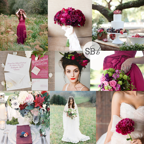 Top row (l-r): Magenta dress {Pearl & Godiva/Corbin Gurkin/Maria Lluisa Rabell}; bouquet {Jesse Leake Photography/Brown Paper Design}; fig cake table {Landon Jacob Photography/Spencer Special Events}