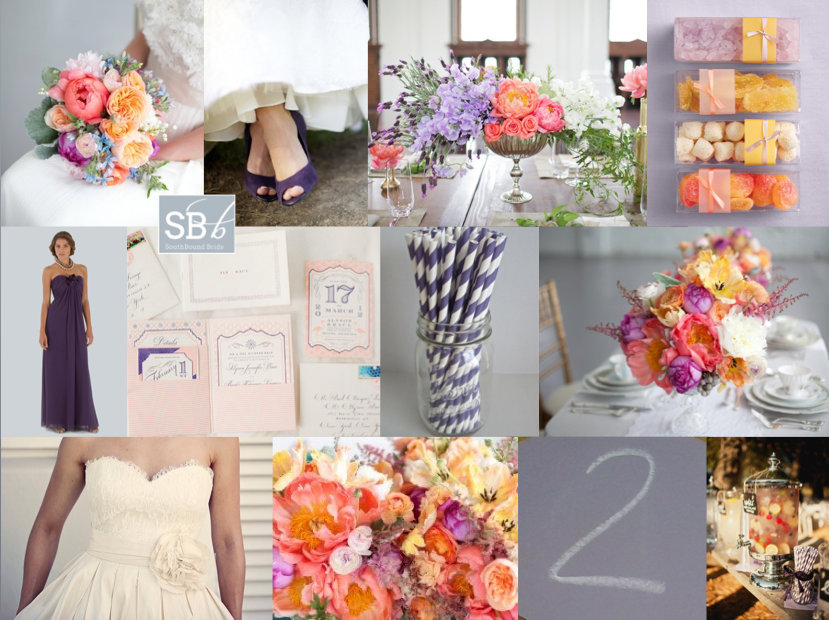 Never let it be said that I don’t love my readers! I know how sometimes planning can be overwhelming (especially bringing all your ideas together as the big day approaches), so when I got a wedding 911 from SouthBound Bride Stephanie, I put together this little board for her quick sharp. Stephanie had chosen a lovely deep purple as her main colour, with beautiful bridesmaid dresses for her girls. However, Stephanie was also in love with colour and fun, but was having a tough time convincing everyone else involved with her wedding that she could be vibrant and still classic and beautiful. Her dream palette – purple combined with coral, yellow and pink – was certainly unusual, so I immediately started looking for florals in this combo. As I suggested to Stephanie, if you’re working with bright colours but you want to make sure they don’t become too much, the best thing to do is keep everything else simple and let the flowers really pop. Because flowers are colours from nature, they have natural tones to them, so you don’t get the same hard colour block effect that you might with something synthetic. It’s a softer and more classic look. Luckily I didn’t have to look too long before I found the perfect inspiration shoot, and all I can say is WOW. Isn’t this palette stunning? I’m such a convert. Paired with simple place settings and classic stationery, the florals really do the talking (and they say “hello, I’m gorgeous”). You’ll notice there are a lot of peonies in the board – and yes, peonies are incredible, but they’re also hard for a South African bride to find. However, chat to your florist about other options, as there are many lush colourful flowers (ranunculus or carnations, for example) that will do a great job here. Another tip I gave Stephanie was not to try to bring all four colours into everything – combine two here, two there, and the result is cumulative.