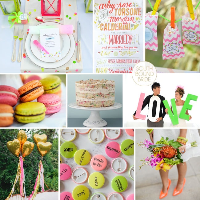 Today’s board is one I never in a million years would have thought I’d be doing. Neon. You know when neon was last cool? About 1991. In 1991, I had just started high school, and my dear mom hadn’t yet taught me that those of us cursed with curly hair could sort it out with a hairdryer (straighteners wouldn’t even be invented for another half a decade – God, I’m old); so on a good day, I looked a bit like Baby in Dirty Dancing and on a bad day, like Sideshow Bob. Which is appropriate, because I was also doing the Bartman, dressing in little minis we referred to as ‘Roxette dresses’, listening to Technotronic and perving over Richard Snell. Who was a cricketer. Happily, I can tell you I haven’t done any of those things since 1992 (sorry, Richard, wherever you are). And yet, here I am, reviving neon. Well, okay, I am not the one who’s revived it. Blame Fashion, because neon is definitely back. And I’ve surprised myself by liking some of the neon inspiration that’s been popping up in Wedding World recently, so I thought I would challenge myself to see if I could imagine it into a wedding. Result? I’m a convert. I think the key (as always) is a bit of moderation – neons look amazing when they stand out against a very white white, and bold mod graphic elements like black and white stripes or gold. It takes them from 80s throwback to Kate Spadey chic, and actually makes for a very stylish palette. The other thing I liked was the use of all the four acids – green, orange, pink and yellow – somehow bringing all four of them into the mix works better for me than just one or two. Put your bridesmaids in bold stripes with bright shoes and nail polish, invest in great stationery and unexpected, colourful flowers, use some bold graphic elements on your tables and then… leave everything else clean, bright and white. Perfect for a fun, city-chic wedding, and ideal with a short 1960s-style dress. So, what do you think? Would you ever consider neon for your wedding?