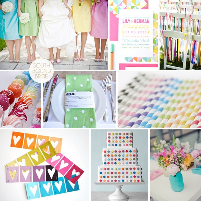 It’s been a colourful day on SBB! Here’s the latest in our week of inspiration boards, and this one was requested by bride-to-be Rita. She and her fiance are getting married in May, and are planning a modern eclectic wedding with a touch of elegance. They want white as the base colour, and then with pops of colour everywhere for their garden ceremony and reception. I personally love this look – even though it’s very colourful, the modern white base keeps it clean and stylish (much like the gorgeous styled shoot we featured earlier today). I love the idea of printed napkins (adding an extra layer of texture), coloured straws, ribbons on the chairs and a multitude of coloured lanterns. Just one word of caution – keep one part of every element plain to make those colours pop and not start looking too chaotic. For example, the bridesmaids below in their rainbow dresses with white bouquets (or change that for crisp white dresses and colourful bouquets), the white band against the coloured napkin, or the painted vases full of colourful blooms on a white runner. And how cute is that cake? Hope you like your board Rita!