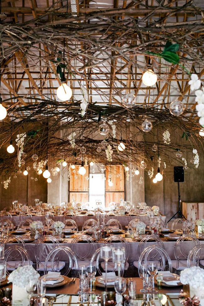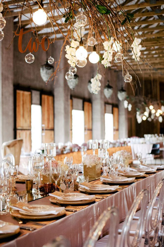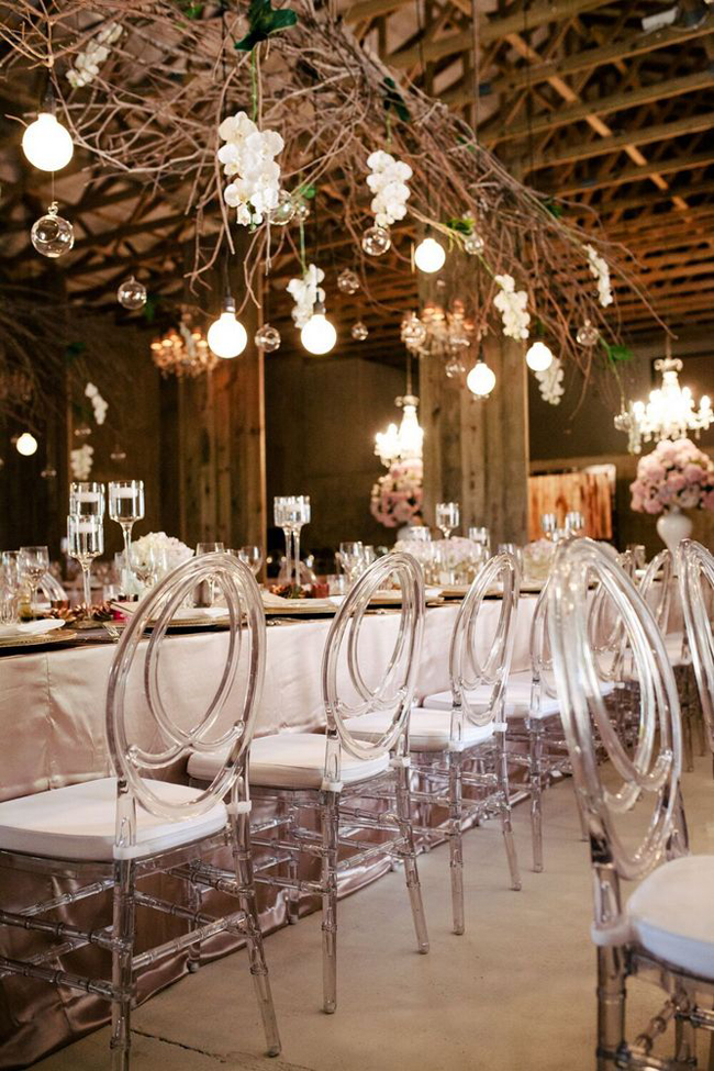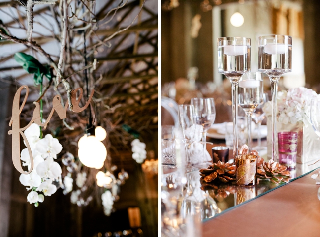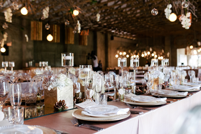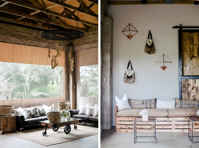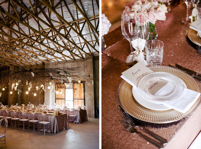 The entire inspiration was rustic versus elegant. We kept the details of the actual building finishes simple, rustic and raw, by bag washing the walls, using recycled old pallets and branches from the farm. In contrast to this all of the decor, lighting and flowers were incredibly elegant. We hung crystal chandeliers in front of wooden pallets, we had orchids hanging among raw branches and our amazing cake was placed on a tree trunk. While all of the flowers were kept white, the color scheme was all natural: nudes and blush tones with touches of rose gold everywhere.